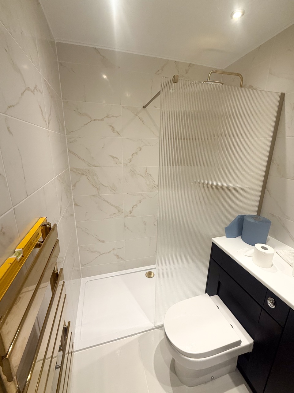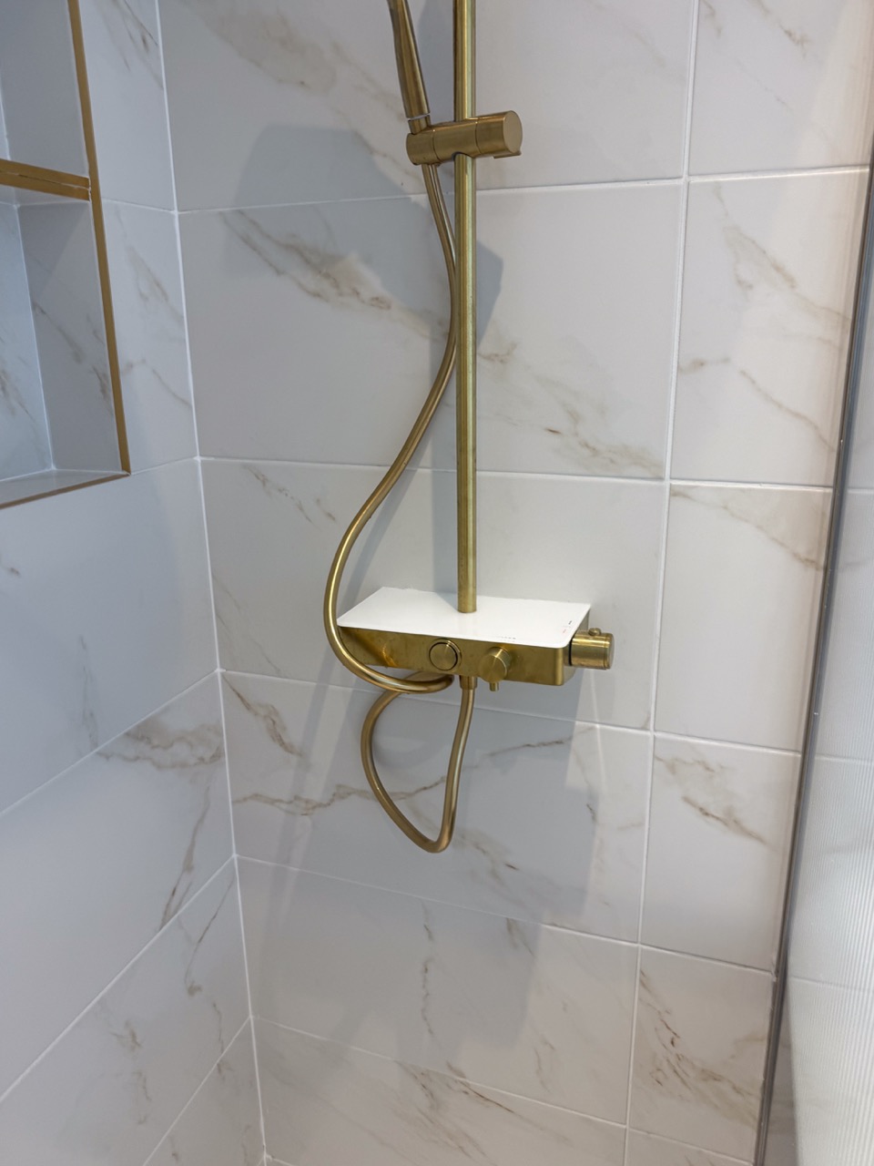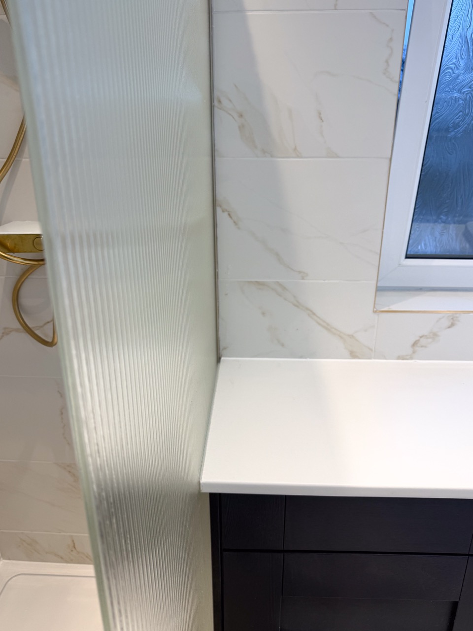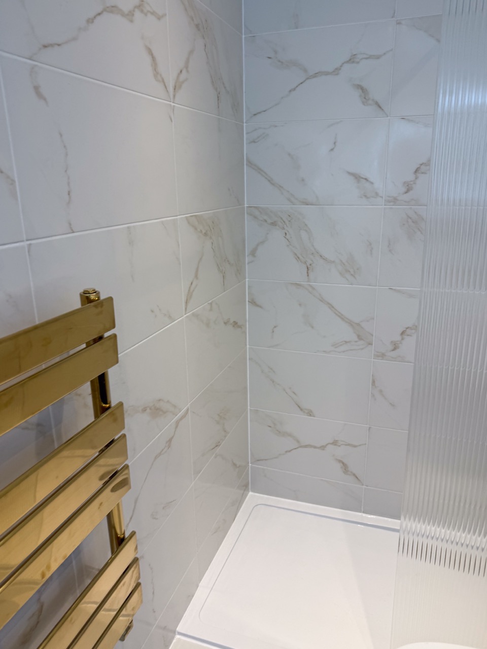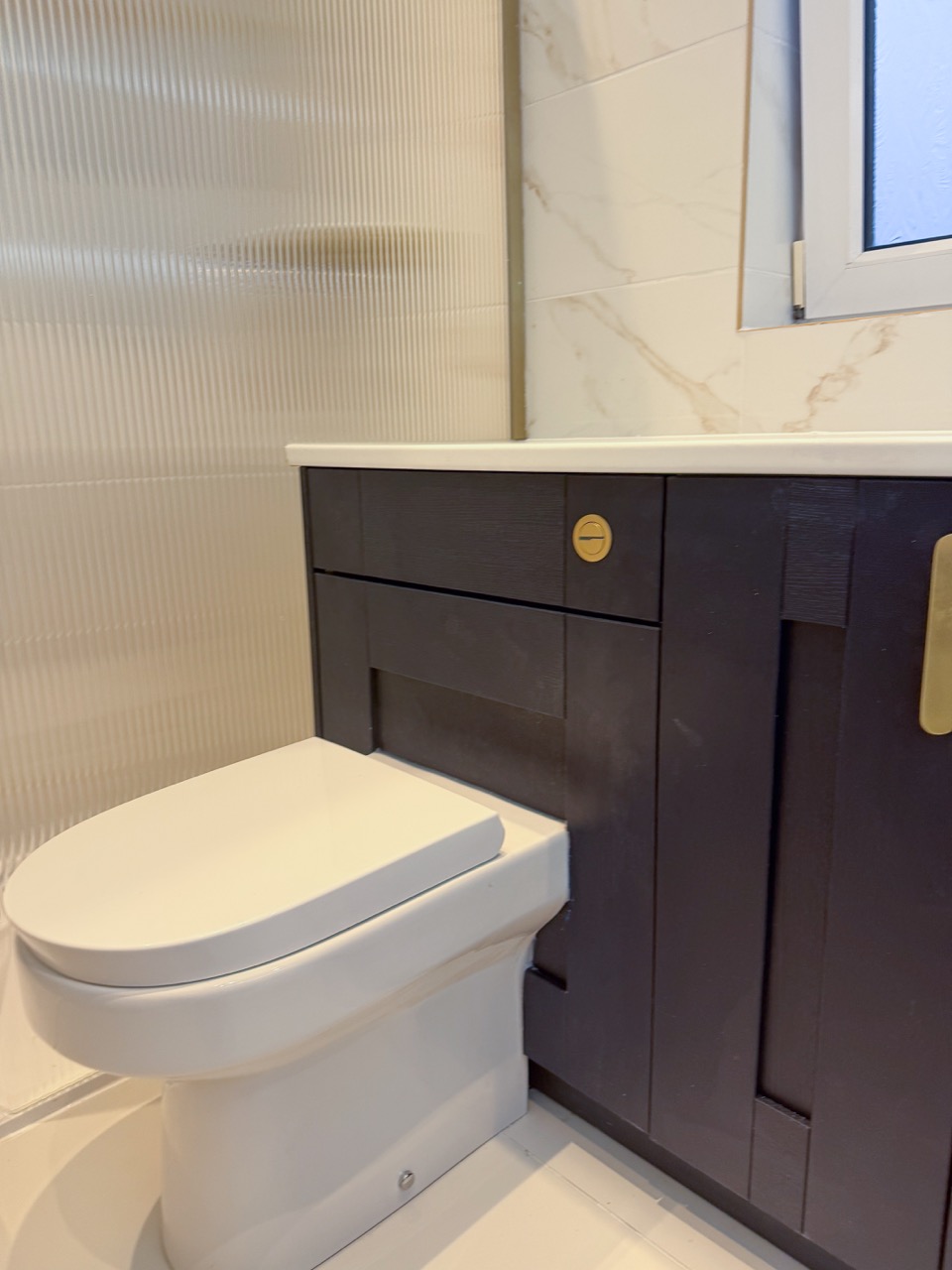 The bathroom was fully tiled on both walls and floor, finished with epoxy grout for a cleaner look and easier long-term maintenance. We also installed a practical shower recess for everyday storage, along with brass fittings and fluted glass to give the shower area a more premium, modern feel.