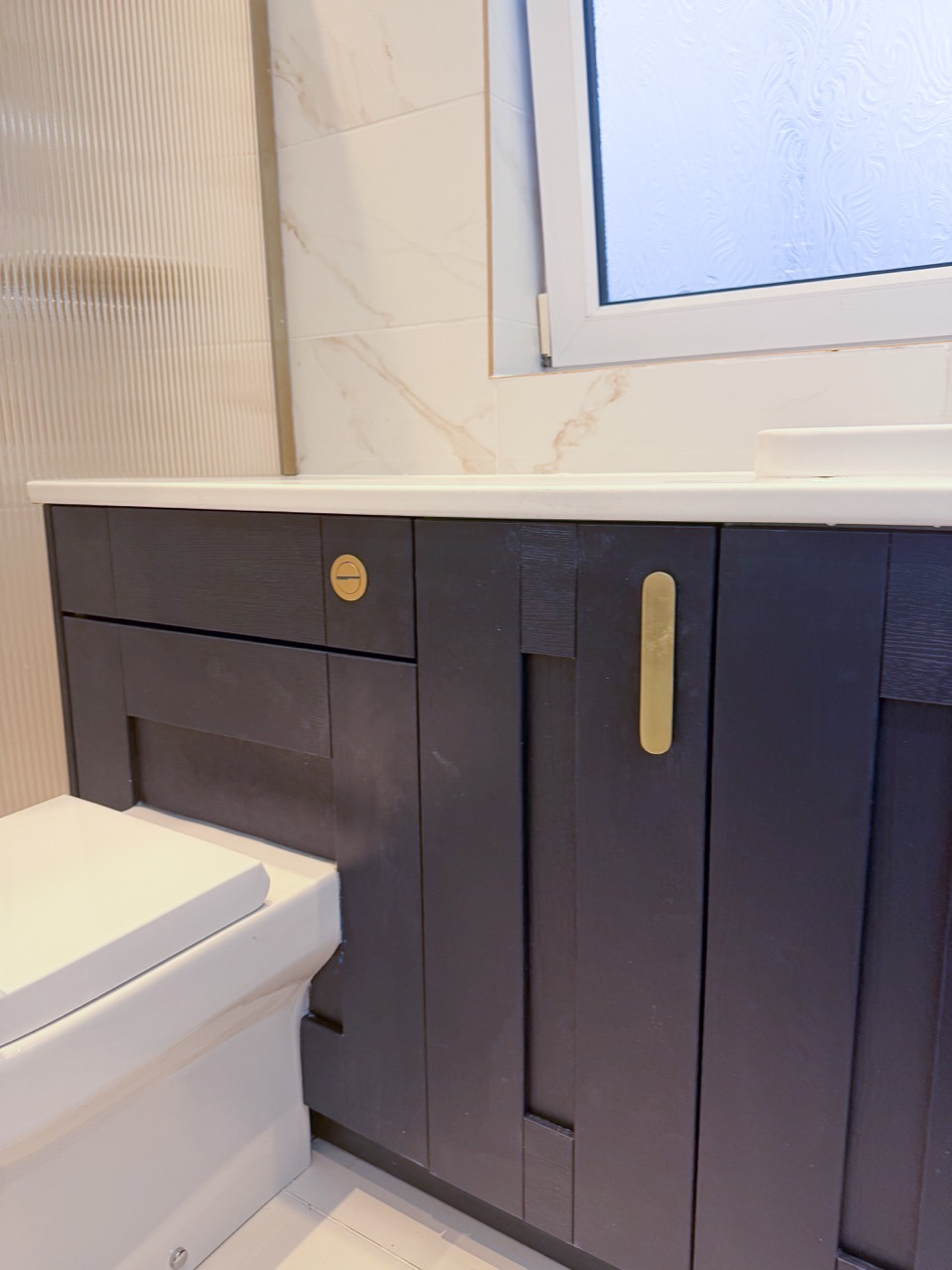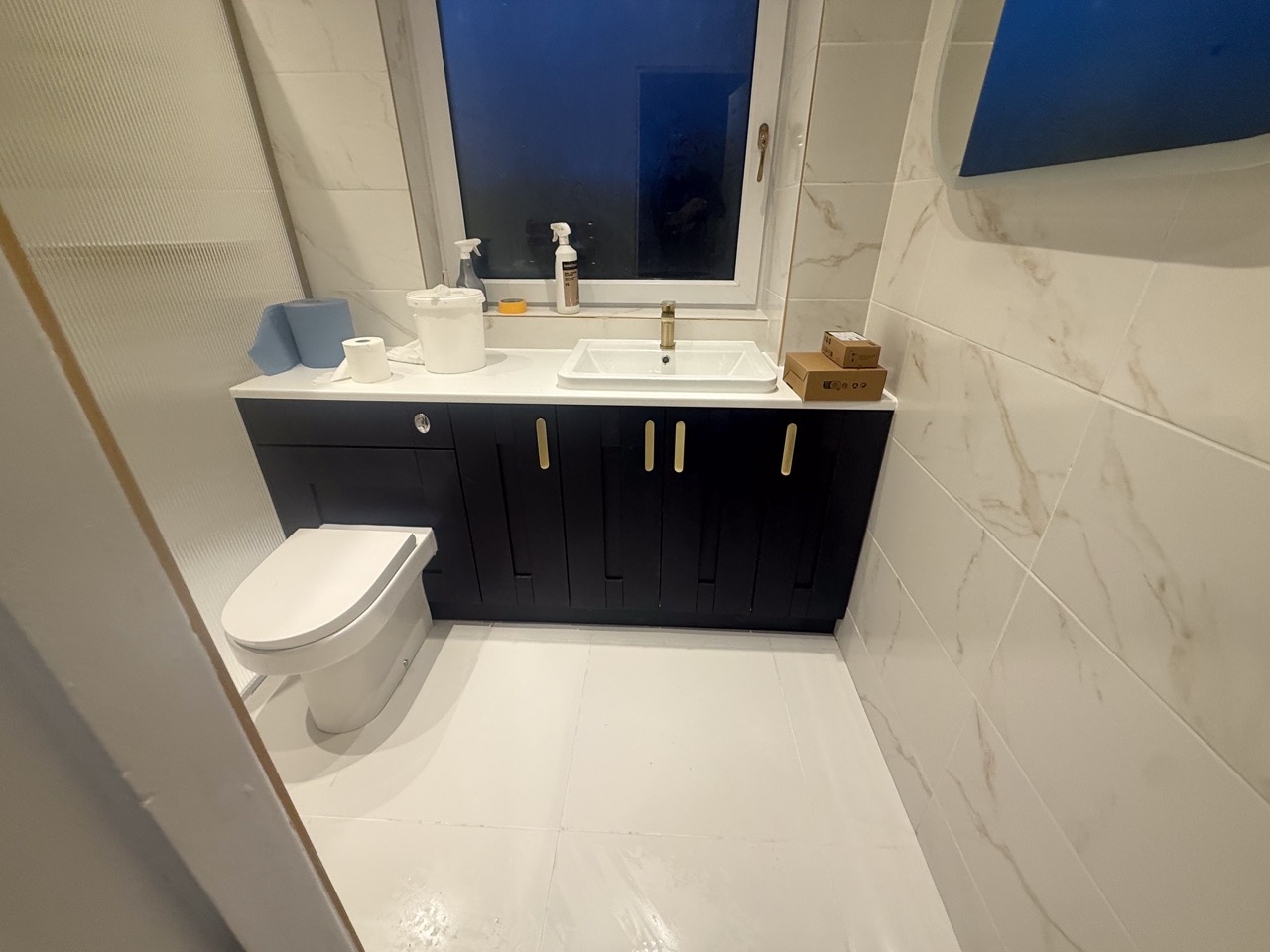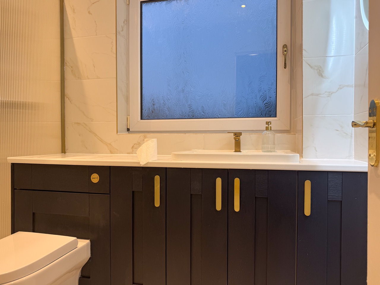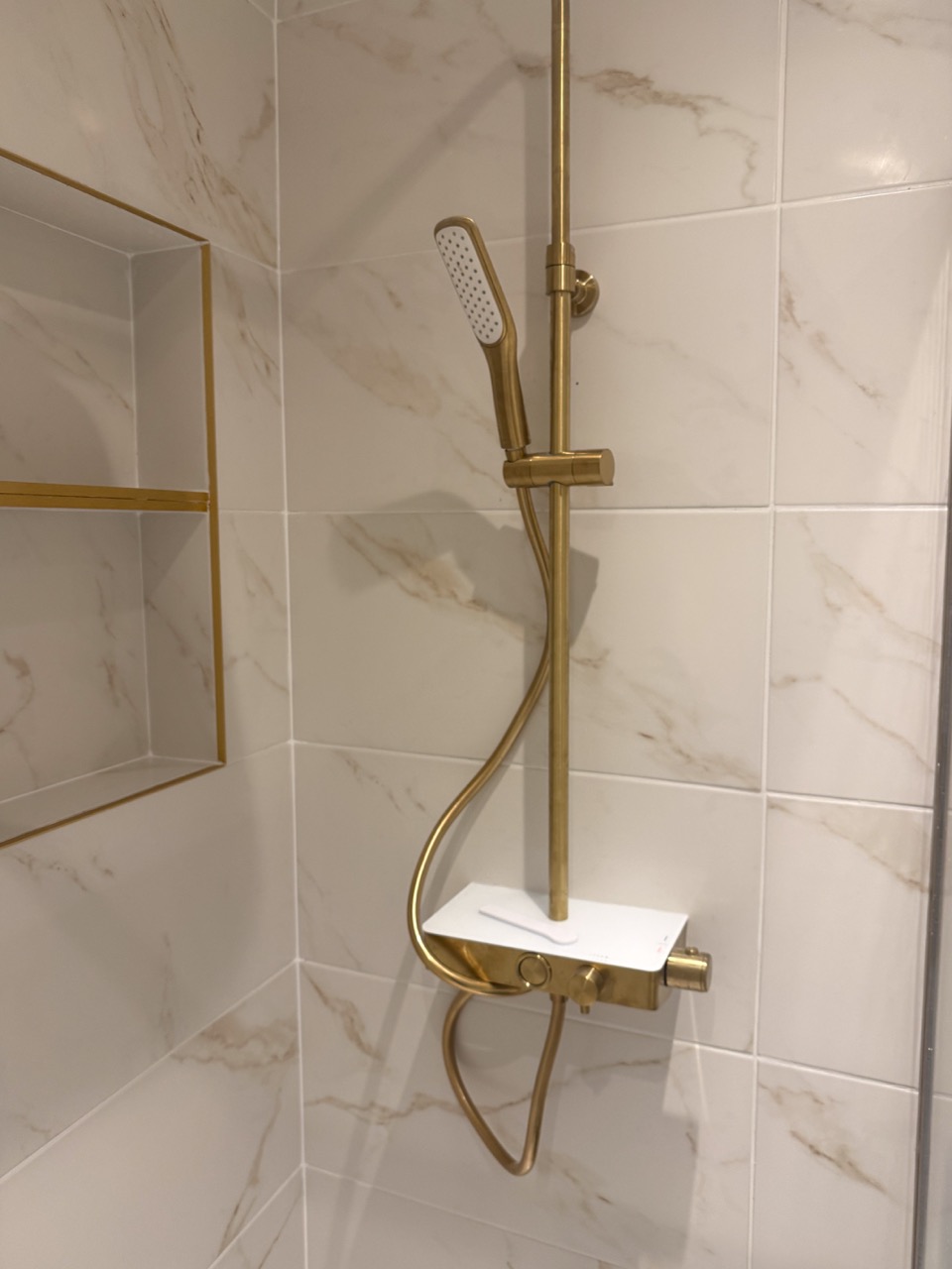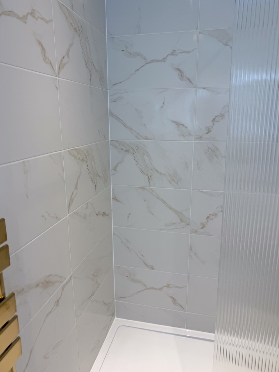 The bathroom was fully tiled on both walls and floor, finished with epoxy grout for a cleaner look and easier long-term maintenance. We also installed a practical shower recess for everyday storage, along with brass fittings and fluted glass to give the shower area a more premium, modern feel.