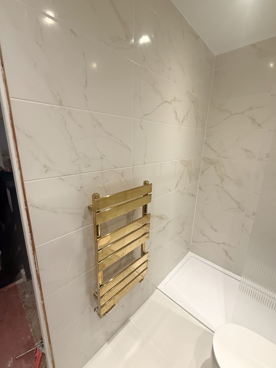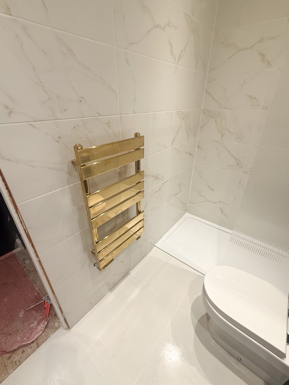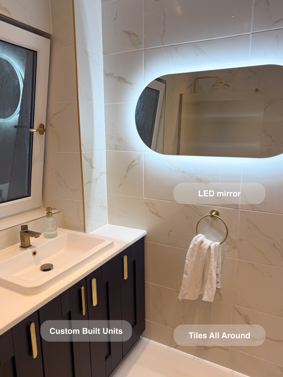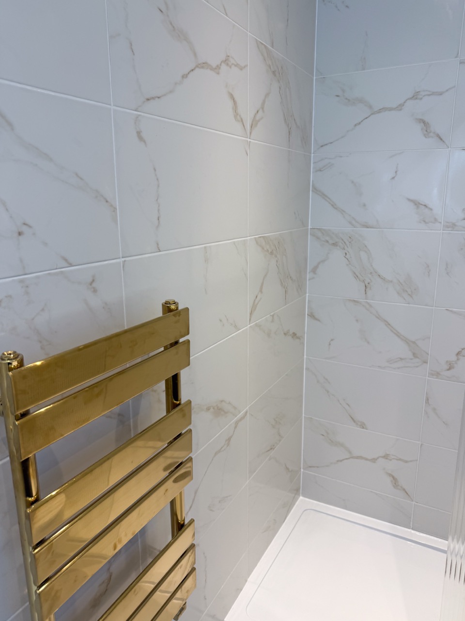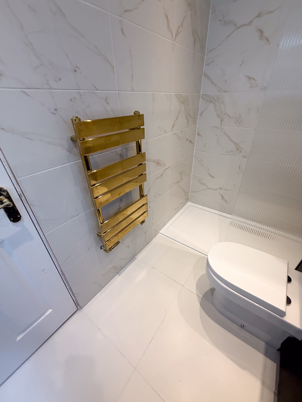 The bathroom was fully tiled on both walls and floor, finished with epoxy grout for a cleaner look and easier long-term maintenance. We also installed a practical shower recess for everyday storage, along with brass fittings and fluted glass to give the shower area a more premium, modern feel.