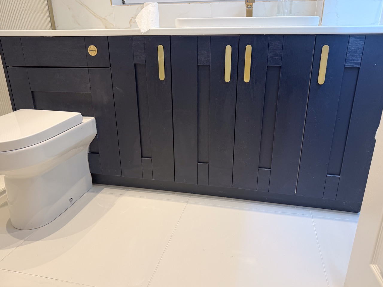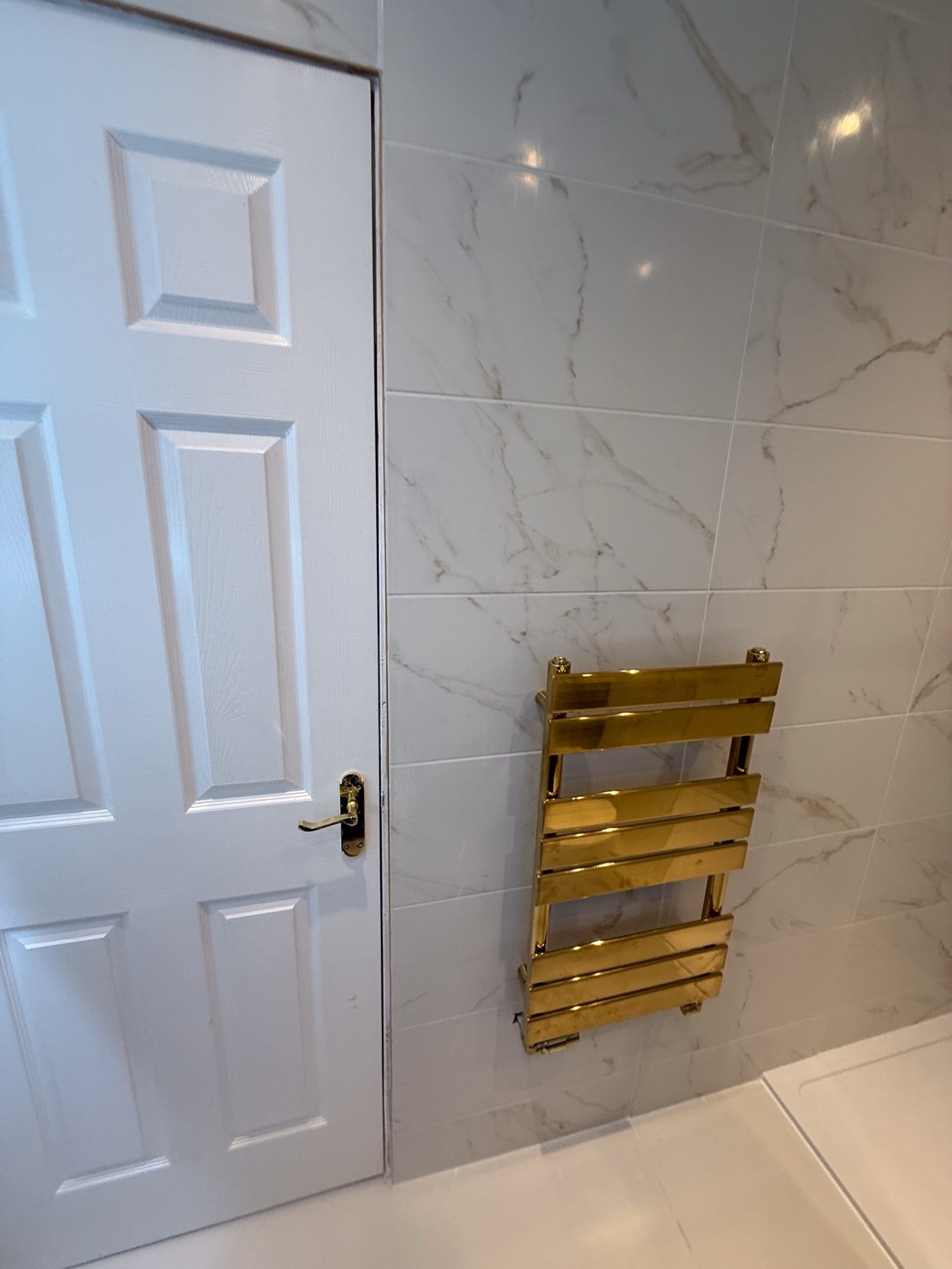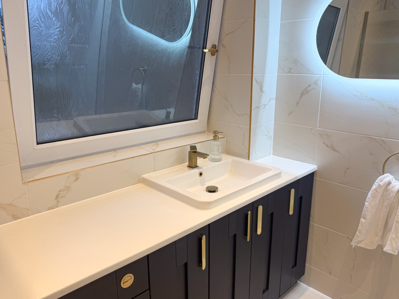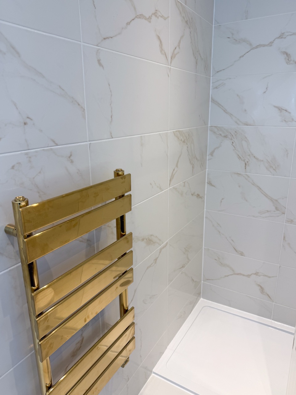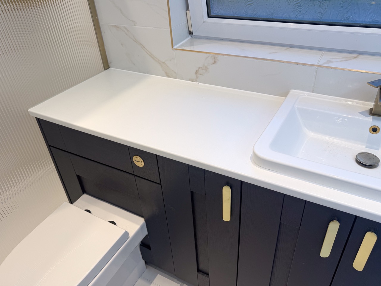 The bathroom was fully tiled on both walls and floor, finished with epoxy grout for a cleaner look and easier long-term maintenance. We also installed a practical shower recess for everyday storage, along with brass fittings and fluted glass to give the shower area a more premium, modern feel.
