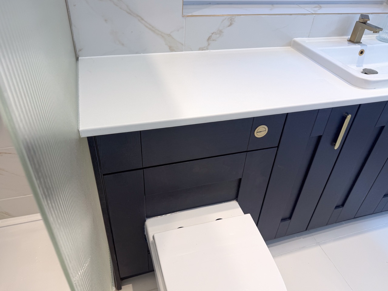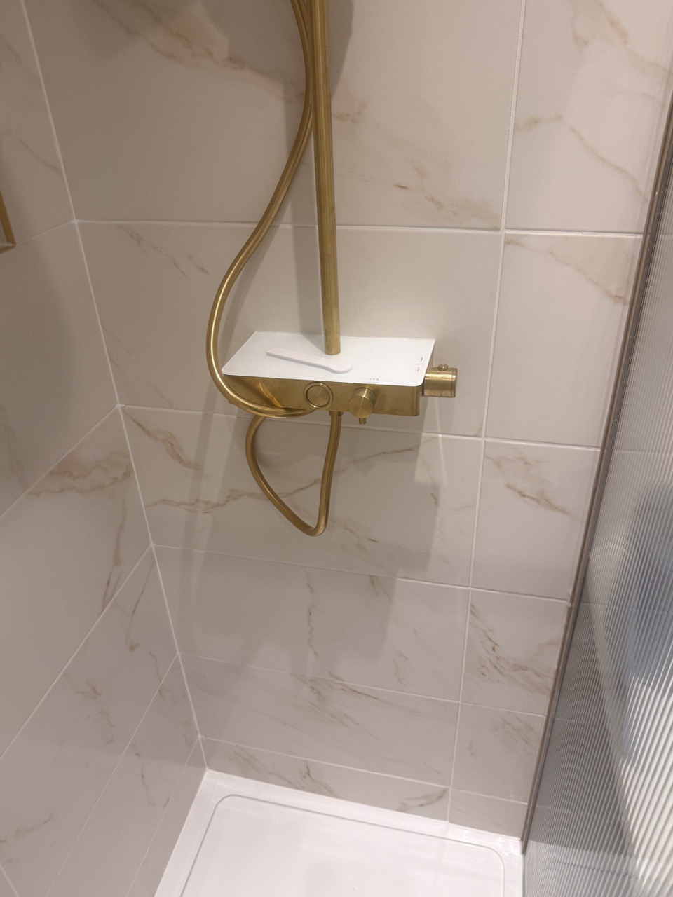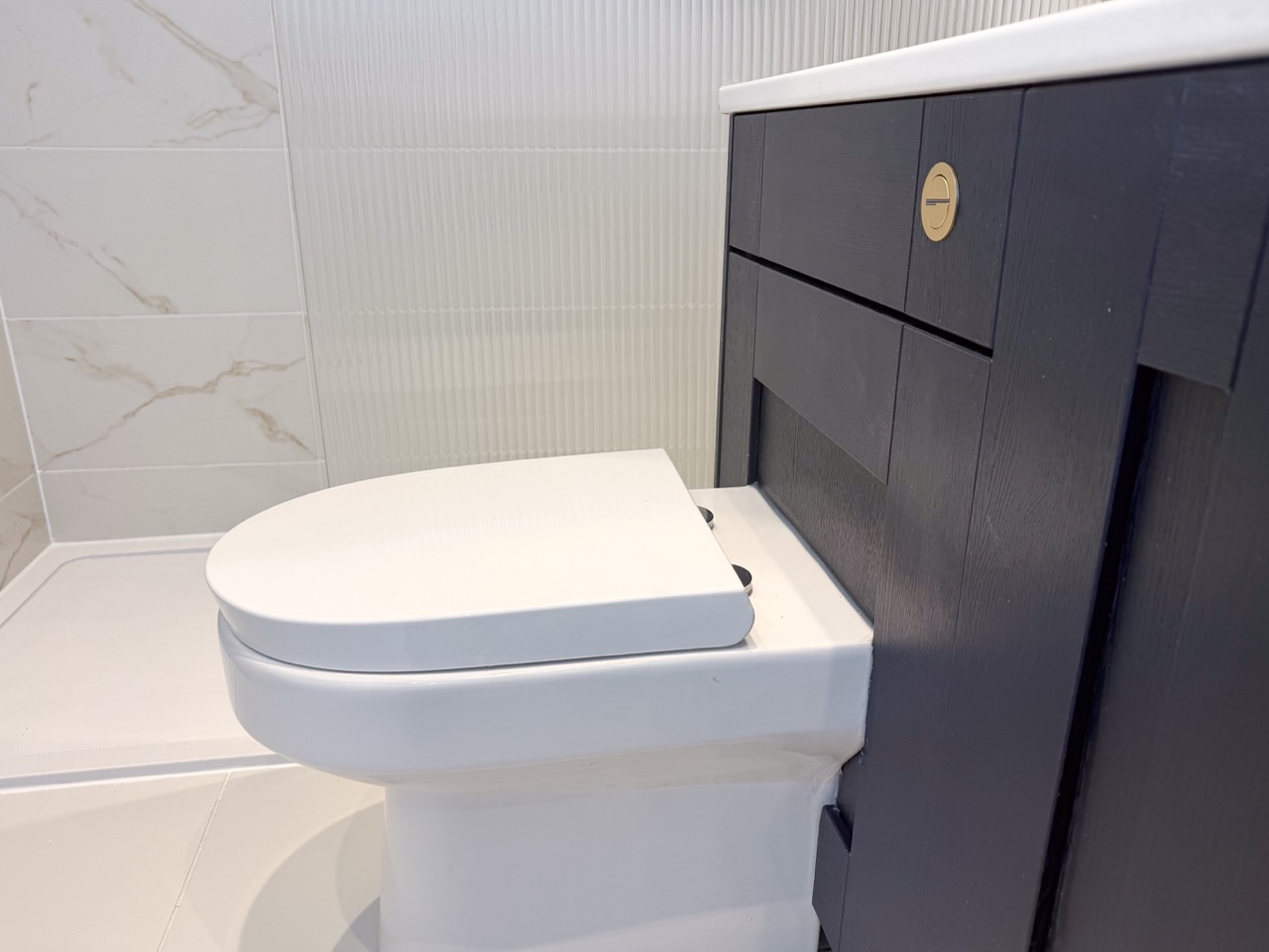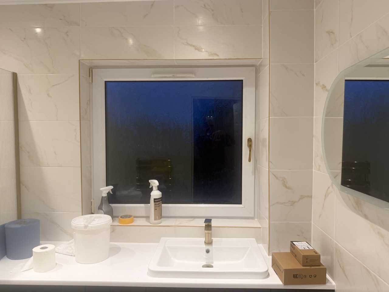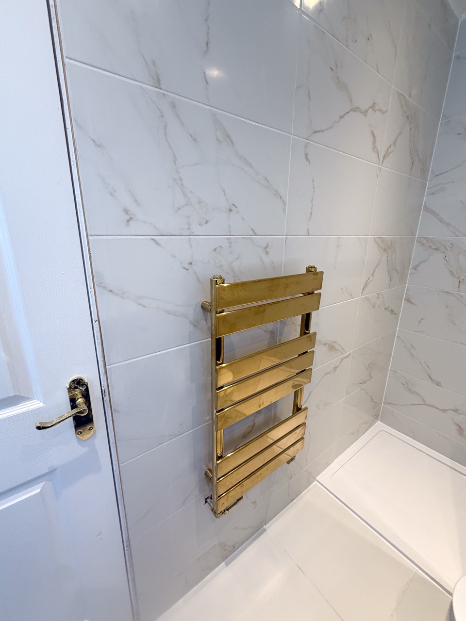 The bathroom was fully tiled on both walls and floor, finished with epoxy grout for a cleaner look and easier long-term maintenance. We also installed a practical shower recess for everyday storage, along with brass fittings and fluted glass to give the shower area a more premium, modern feel.