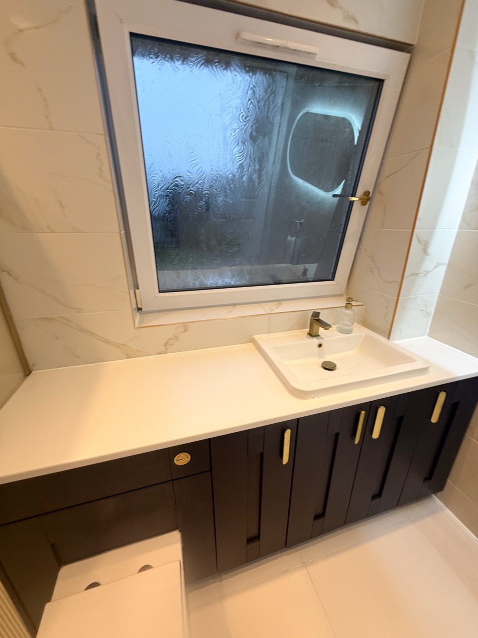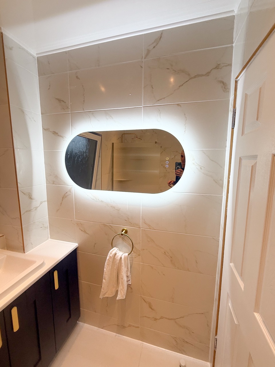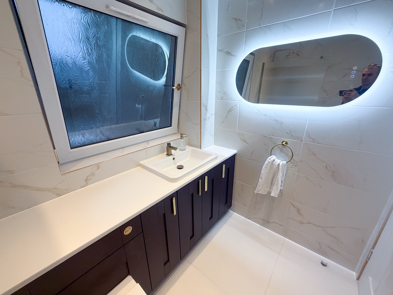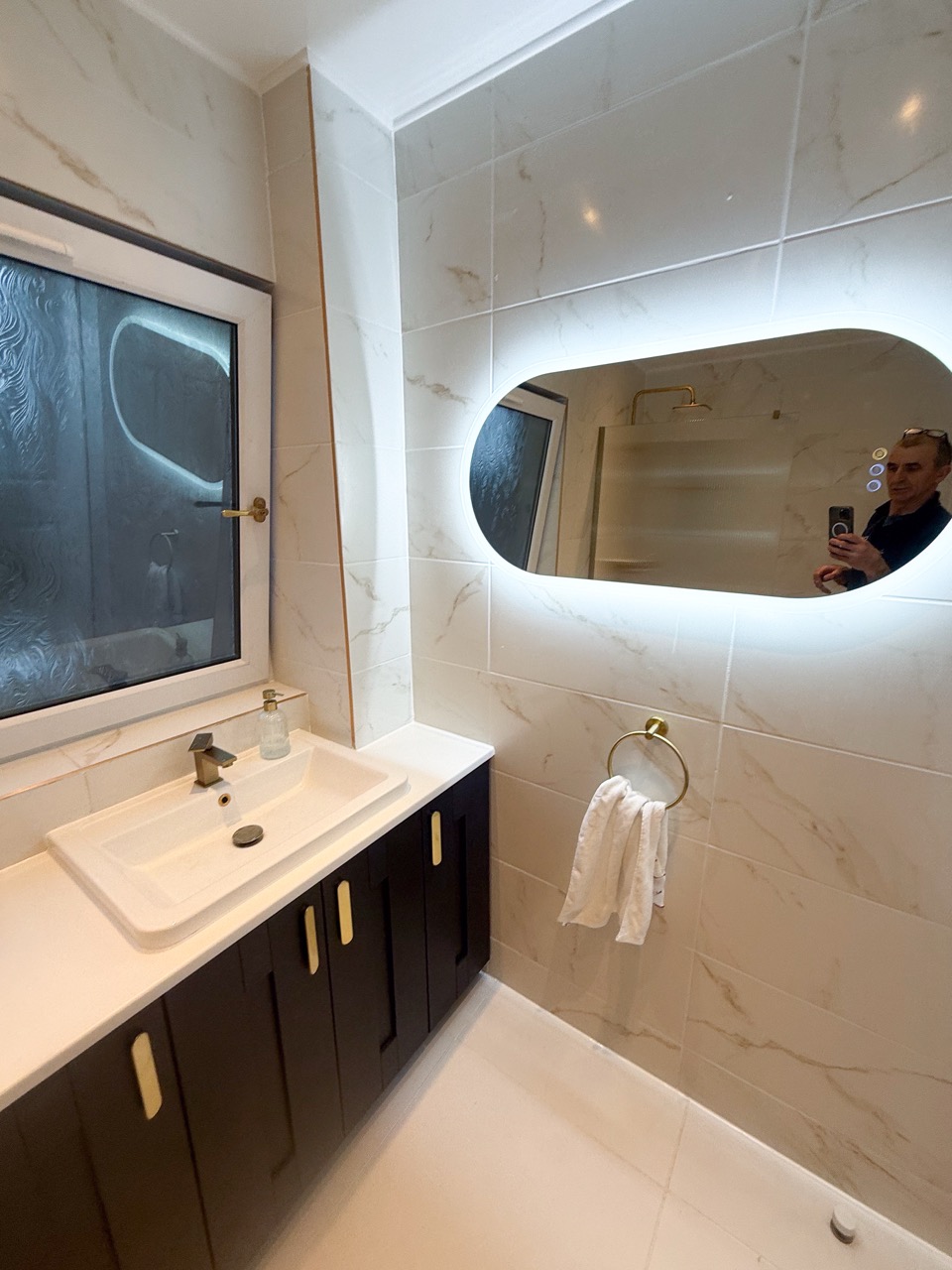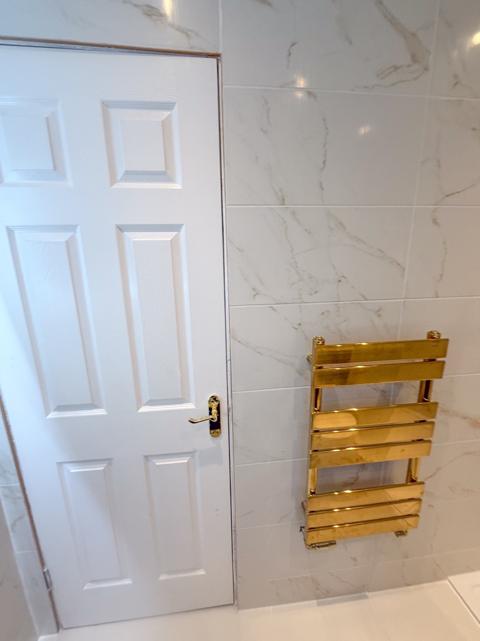 The bathroom was fully tiled on both walls and floor, finished with epoxy grout for a cleaner look and easier long-term maintenance. We also installed a practical shower recess for everyday storage, along with brass fittings and fluted glass to give the shower area a more premium, modern feel.