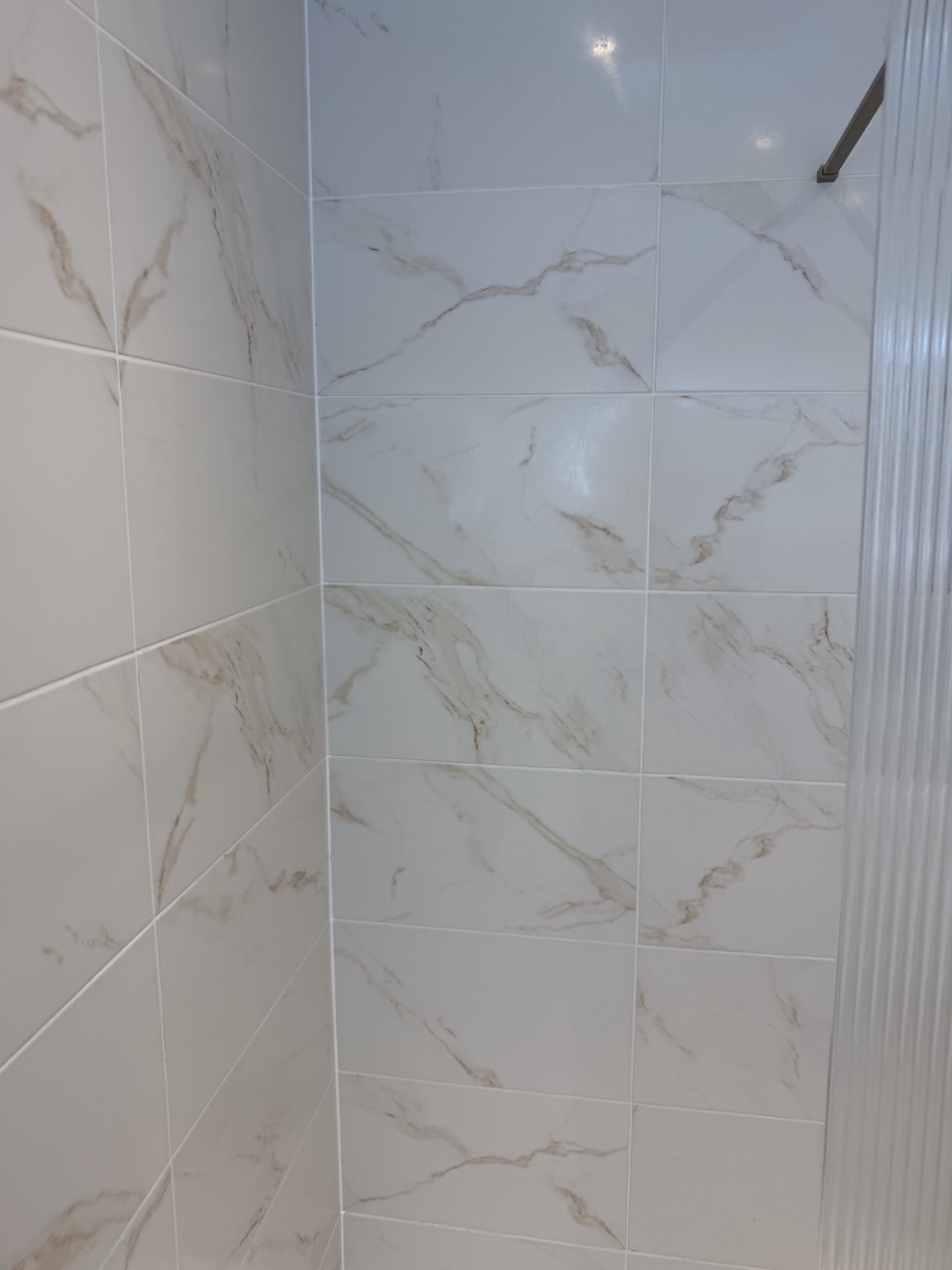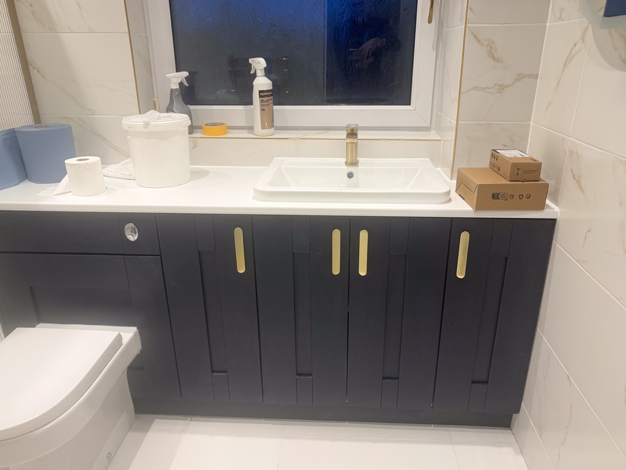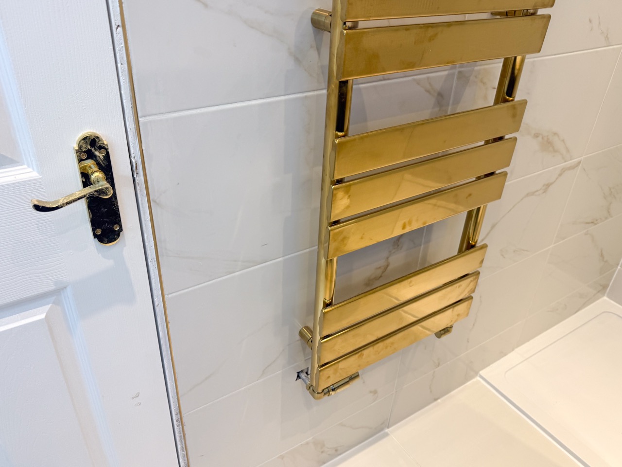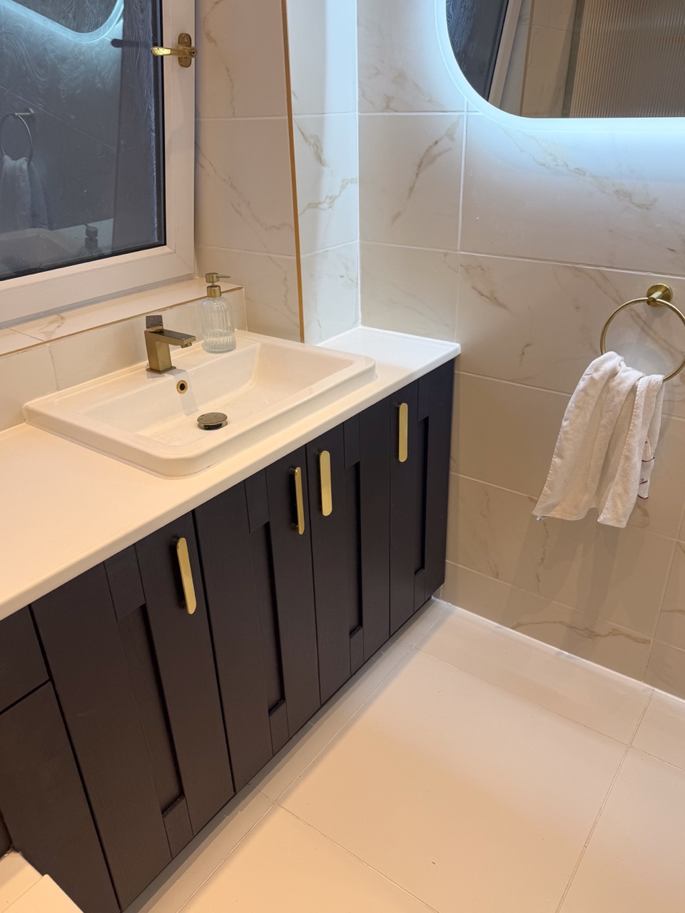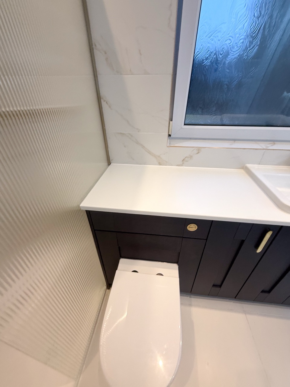 The bathroom was fully tiled on both walls and floor, finished with epoxy grout for a cleaner look and easier long-term maintenance. We also installed a practical shower recess for everyday storage, along with brass fittings and fluted glass to give the shower area a more premium, modern feel.