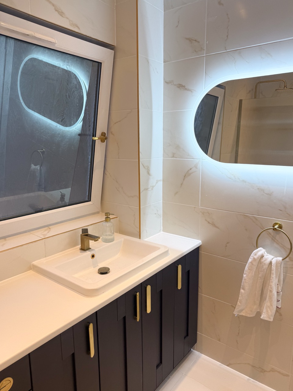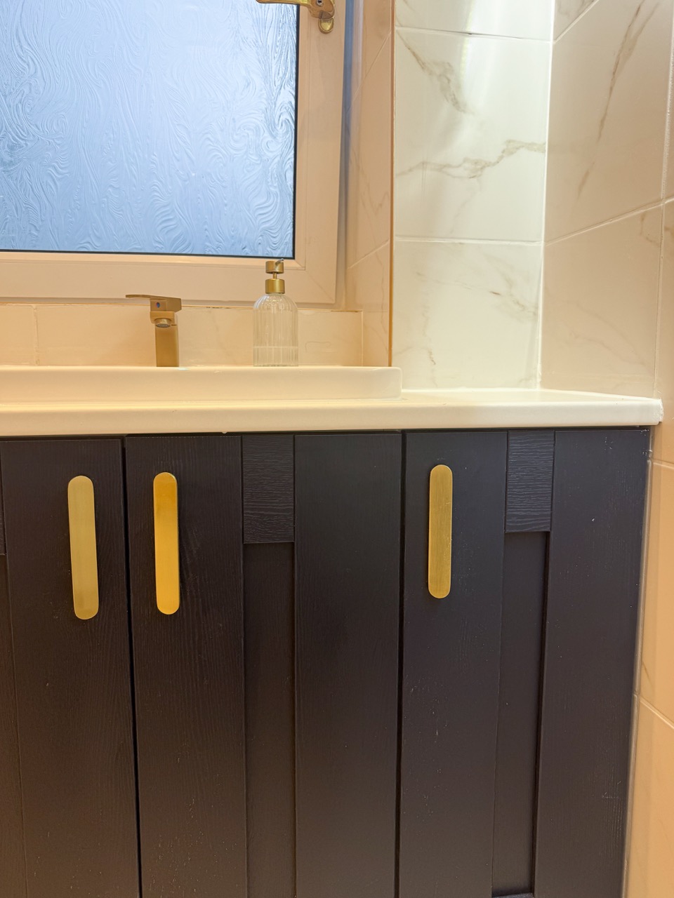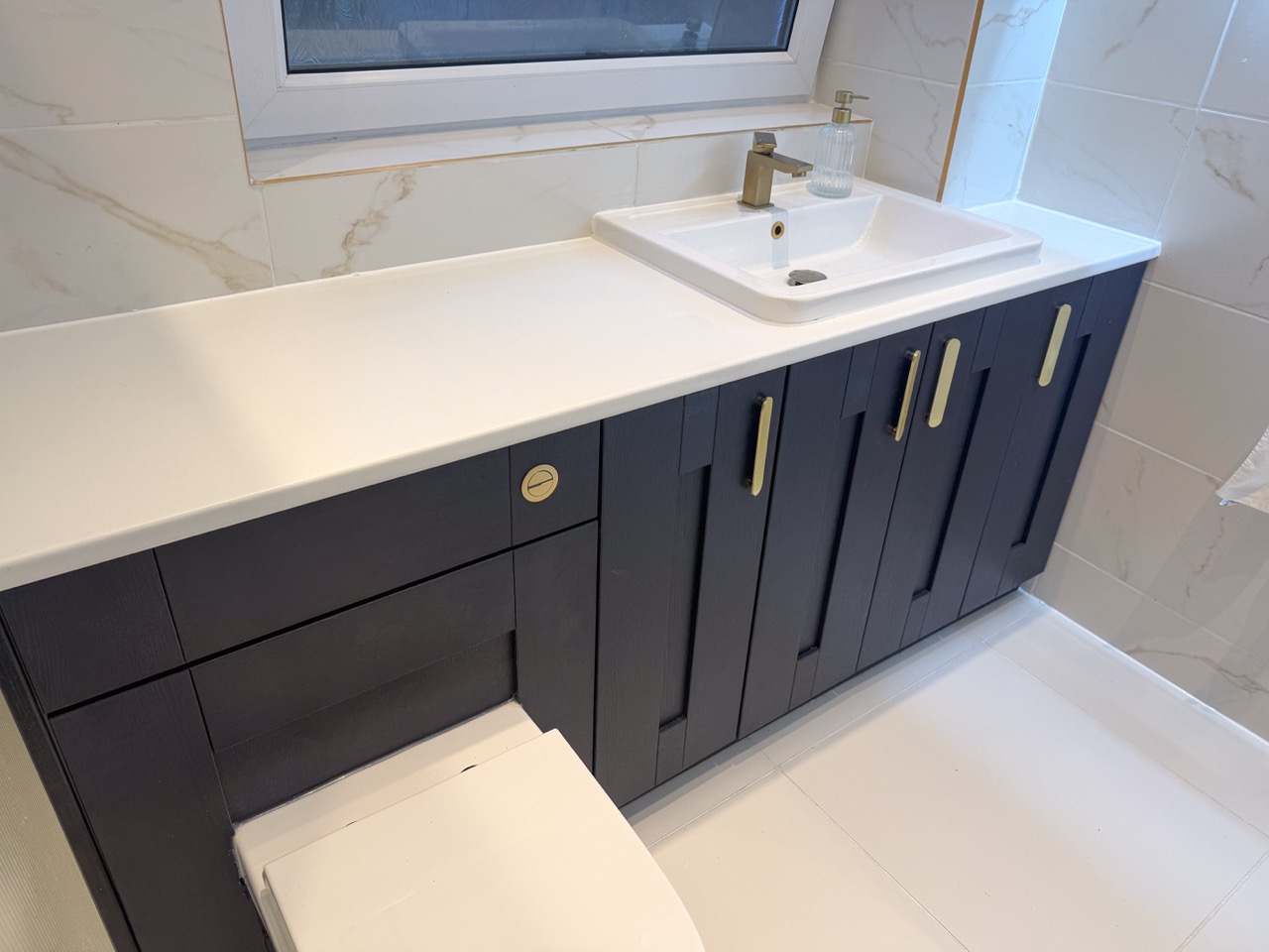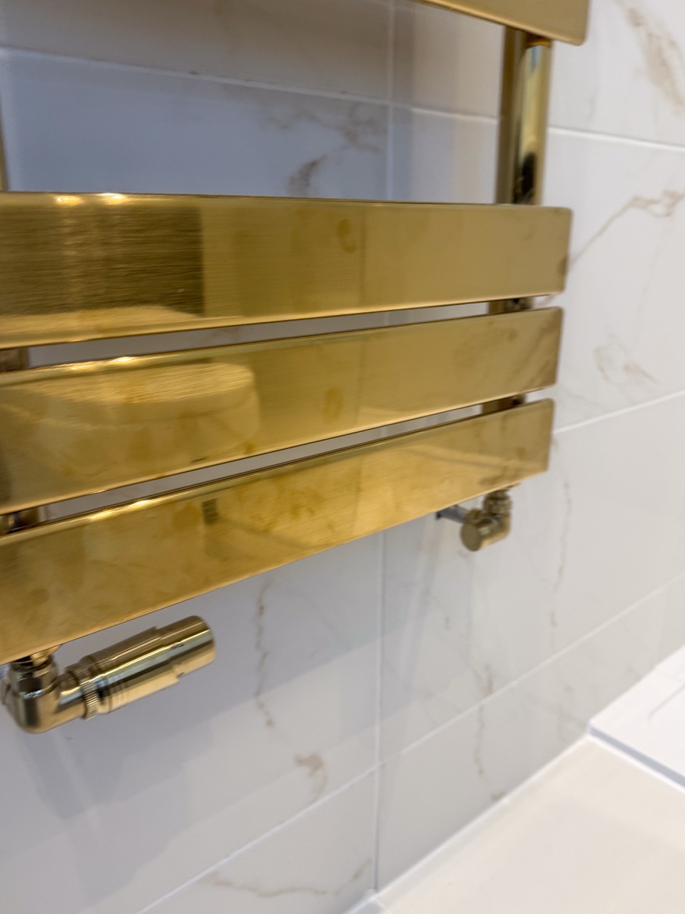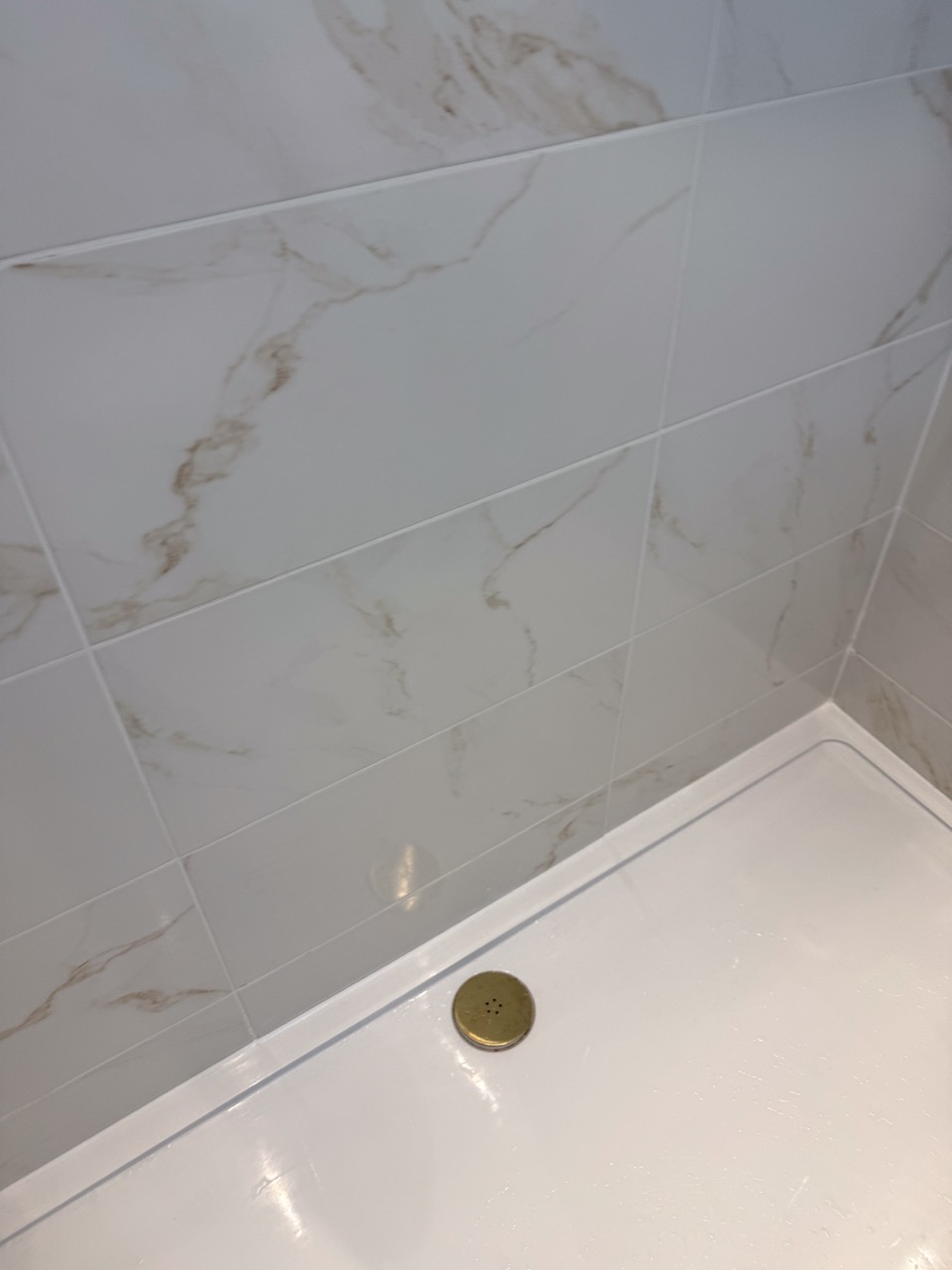 The bathroom was fully tiled on both walls and floor, finished with epoxy grout for a cleaner look and easier long-term maintenance. We also installed a practical shower recess for everyday storage, along with brass fittings and fluted glass to give the shower area a more premium, modern feel.