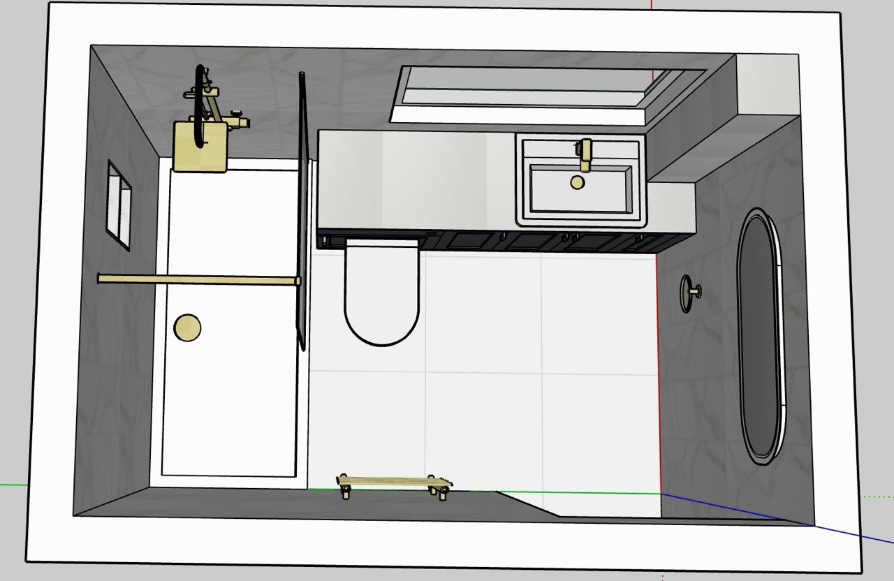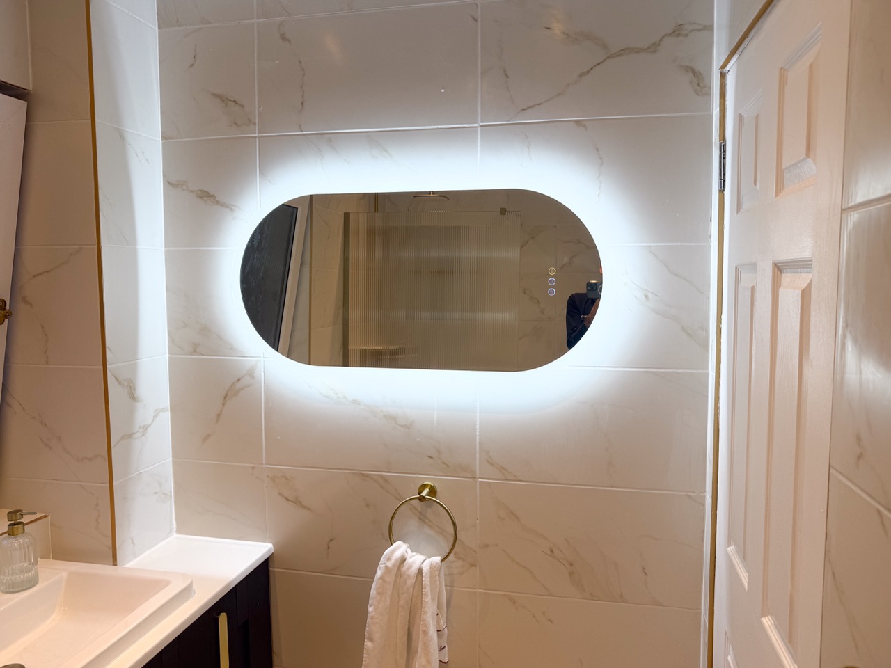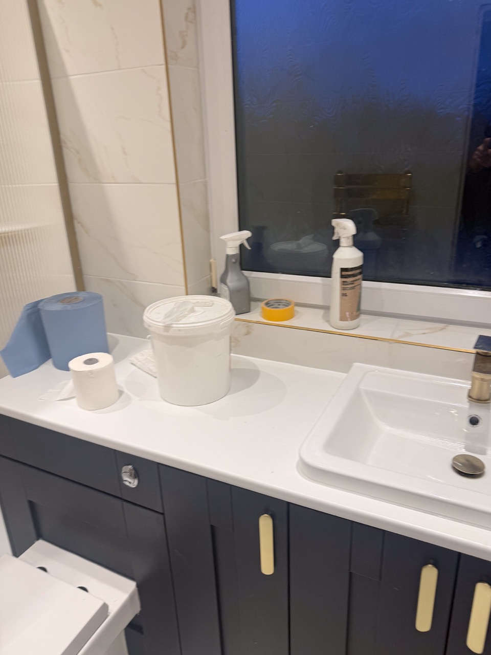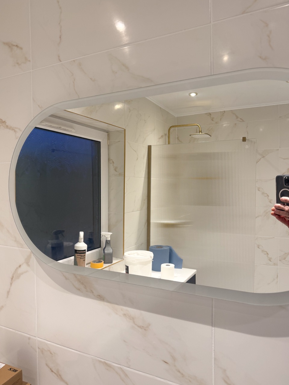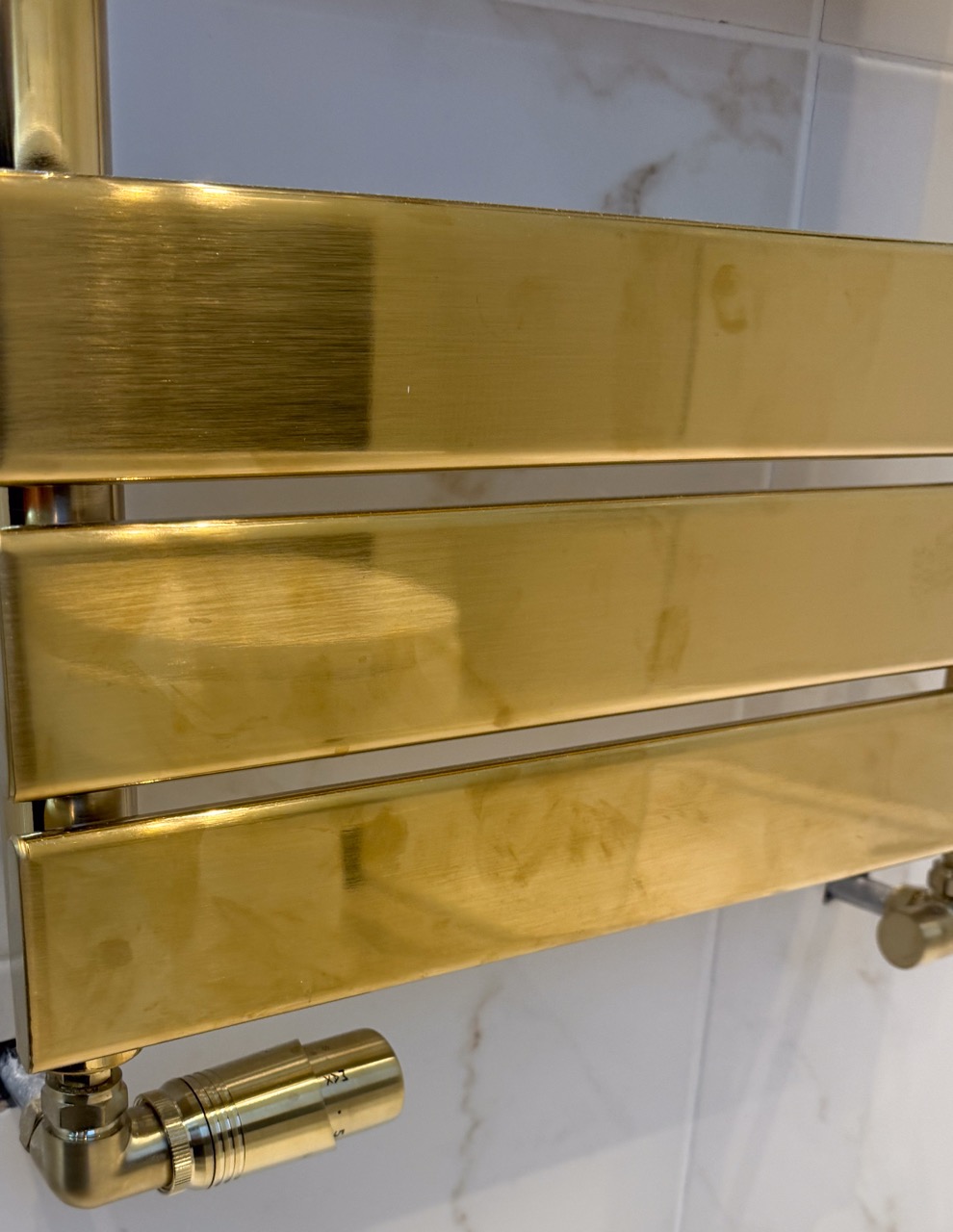 The bathroom was fully tiled on both walls and floor, finished with epoxy grout for a cleaner look and easier long-term maintenance. We also installed a practical shower recess for everyday storage, along with brass fittings and fluted glass to give the shower area a more premium, modern feel.