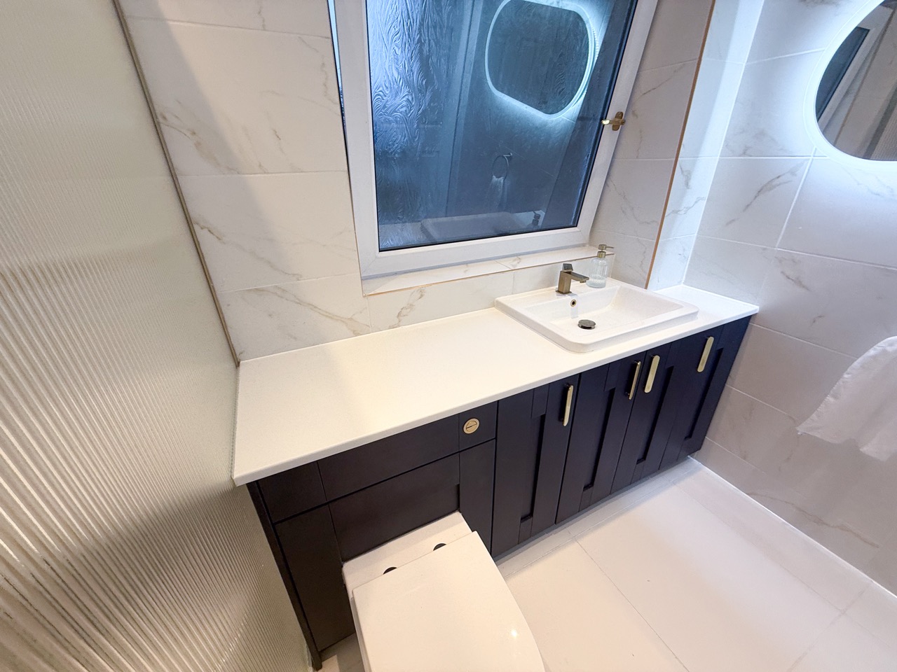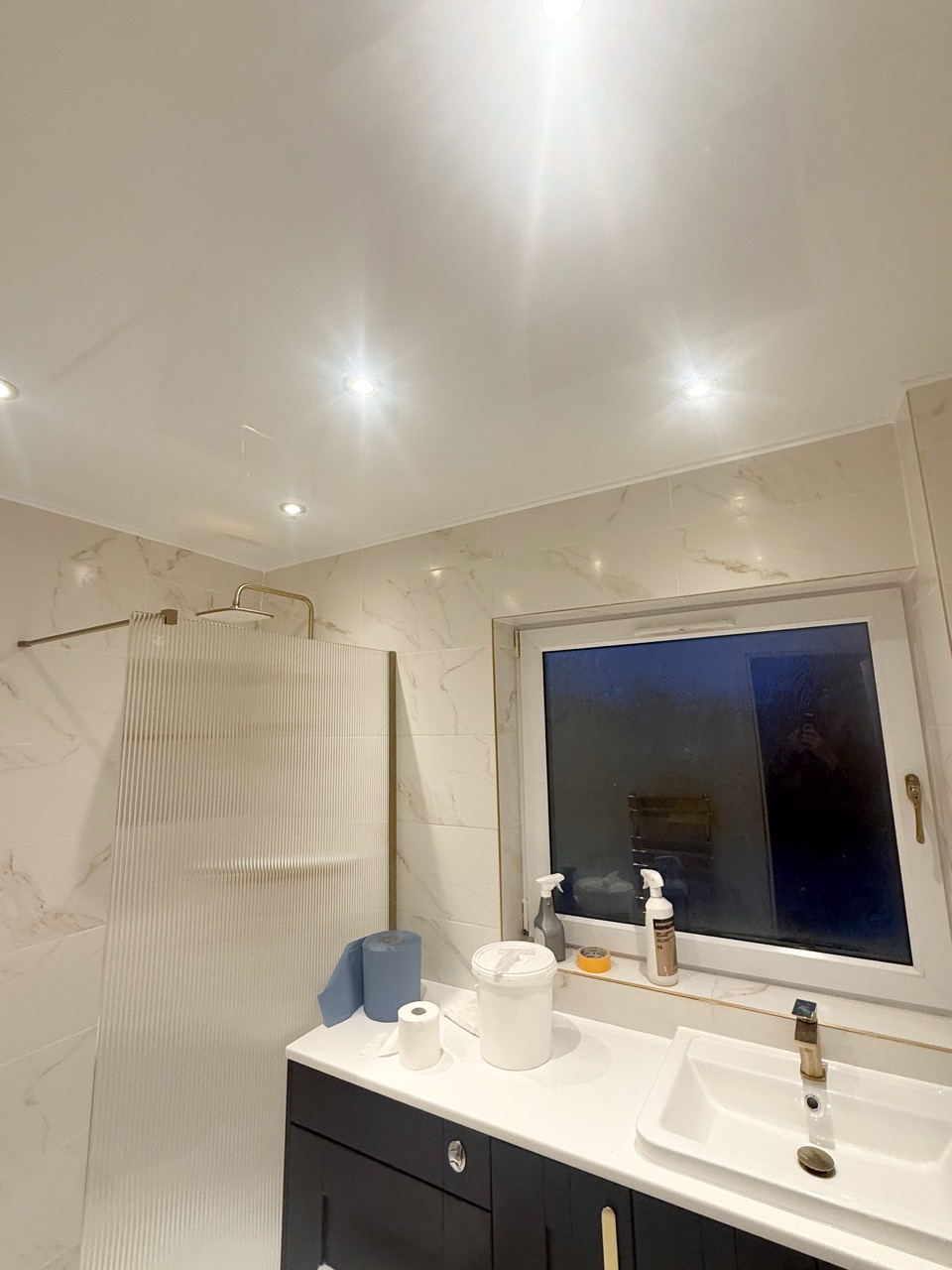 Finally, we finished the space with a UPVC ceiling and downlights, creating a brighter, cleaner and more polished bathroom overall.