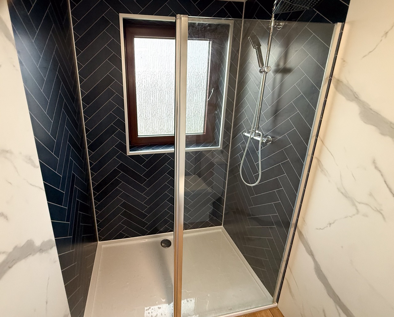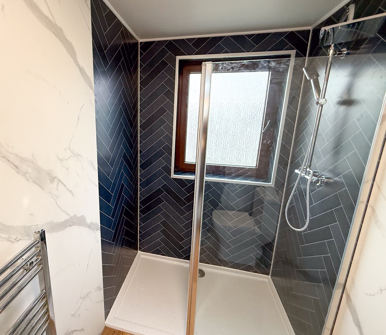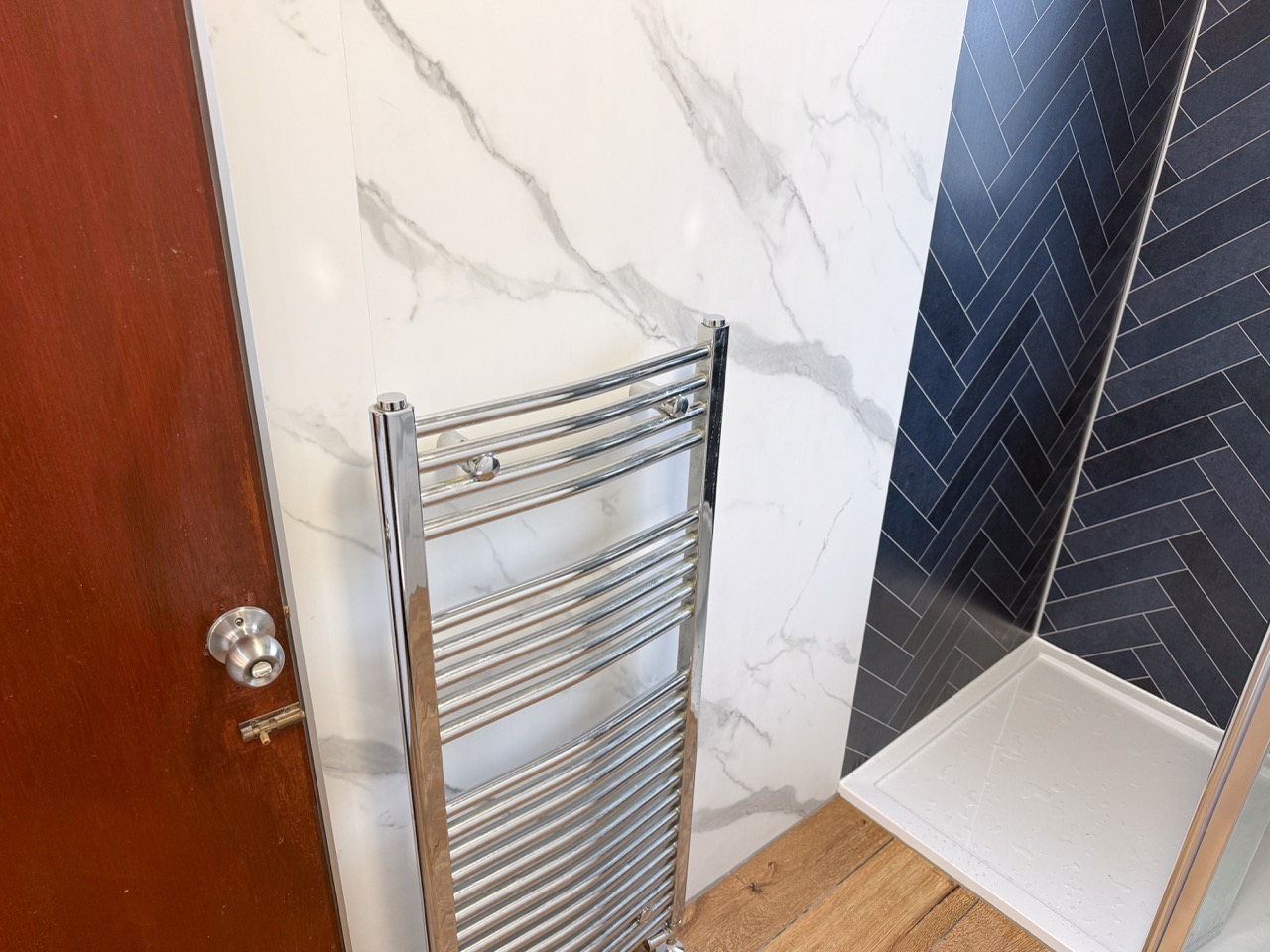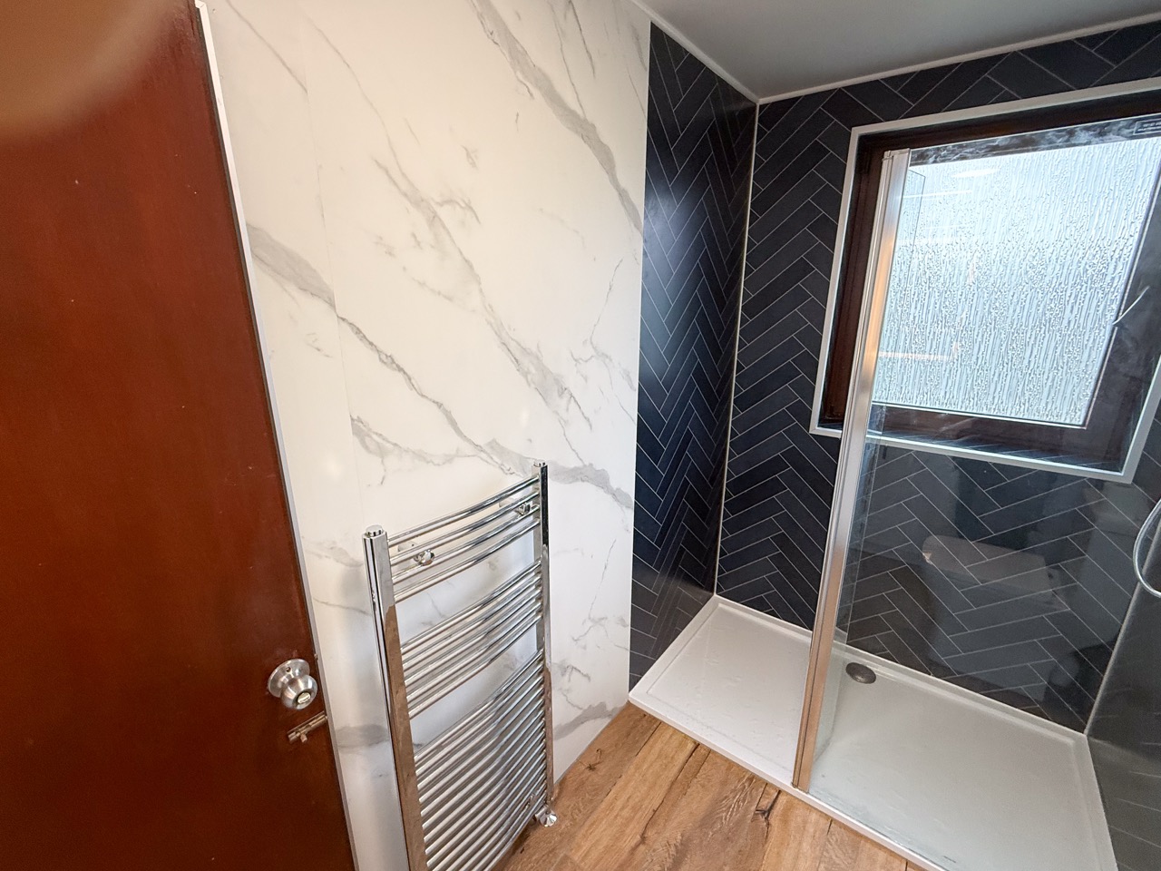 To keep the bathroom bright, clean-looking and easy to maintain, we used tile-effect panels in the shower area and marble-effect panels through the rest of the room, including behind the units. The oak-effect floor tiles add warmth and help the space feel more inviting rather than cold and clinical.