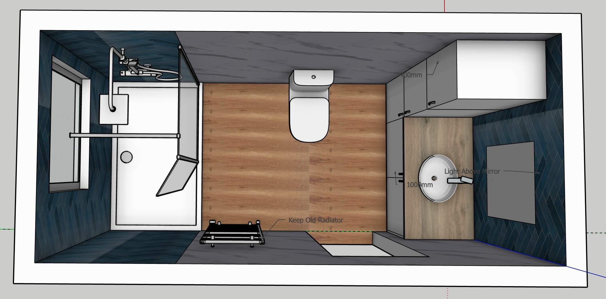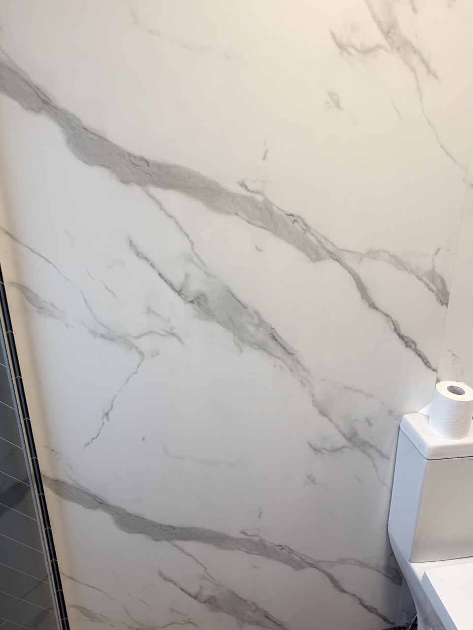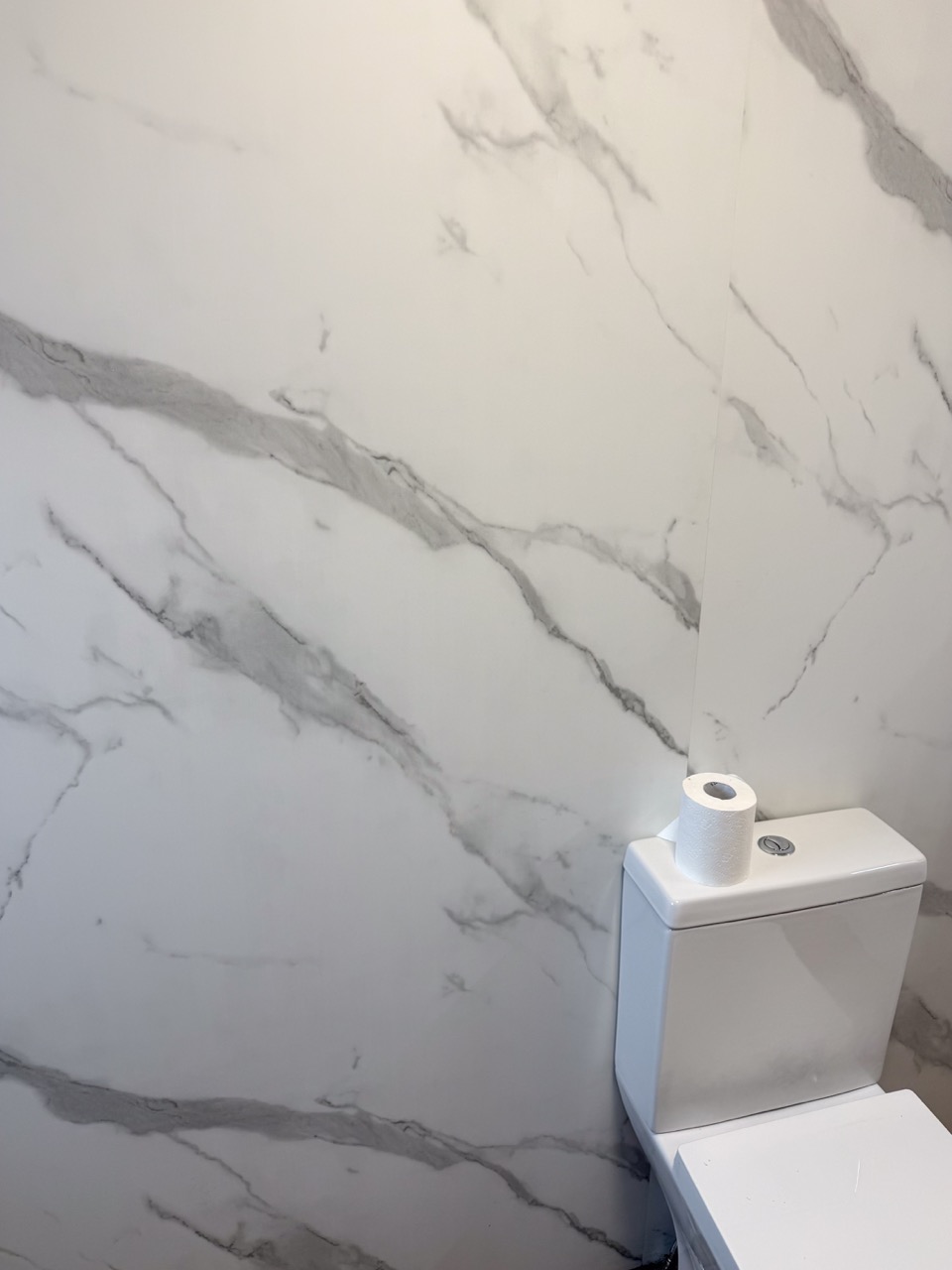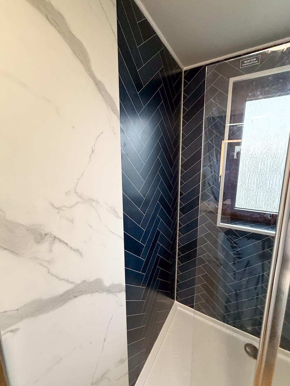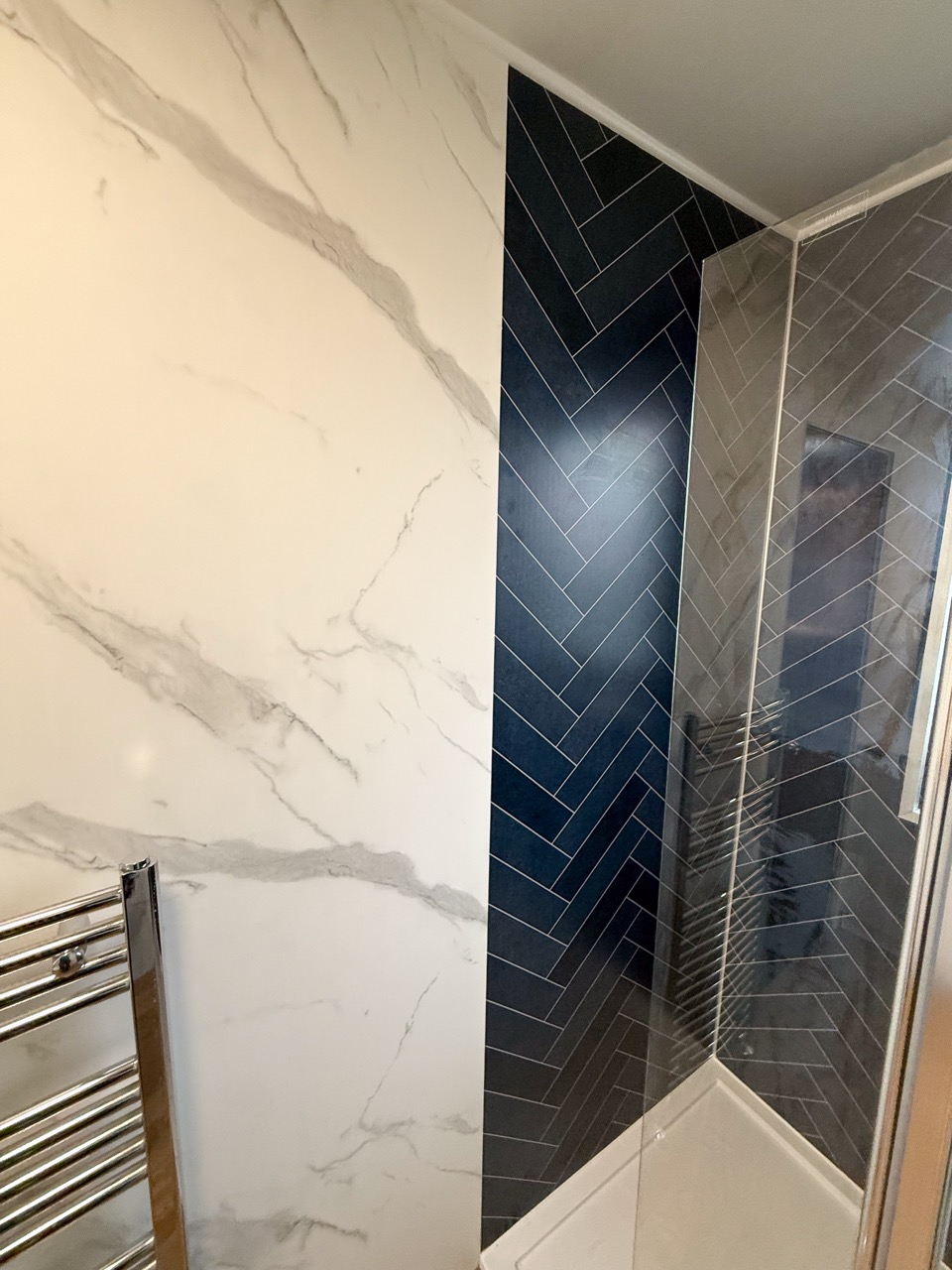 To keep the bathroom bright, clean-looking and easy to maintain, we used tile-effect panels in the shower area and marble-effect panels through the rest of the room, including behind the units. The oak-effect floor tiles add warmth and help the space feel more inviting rather than cold and clinical.