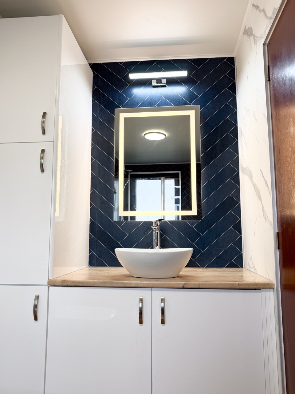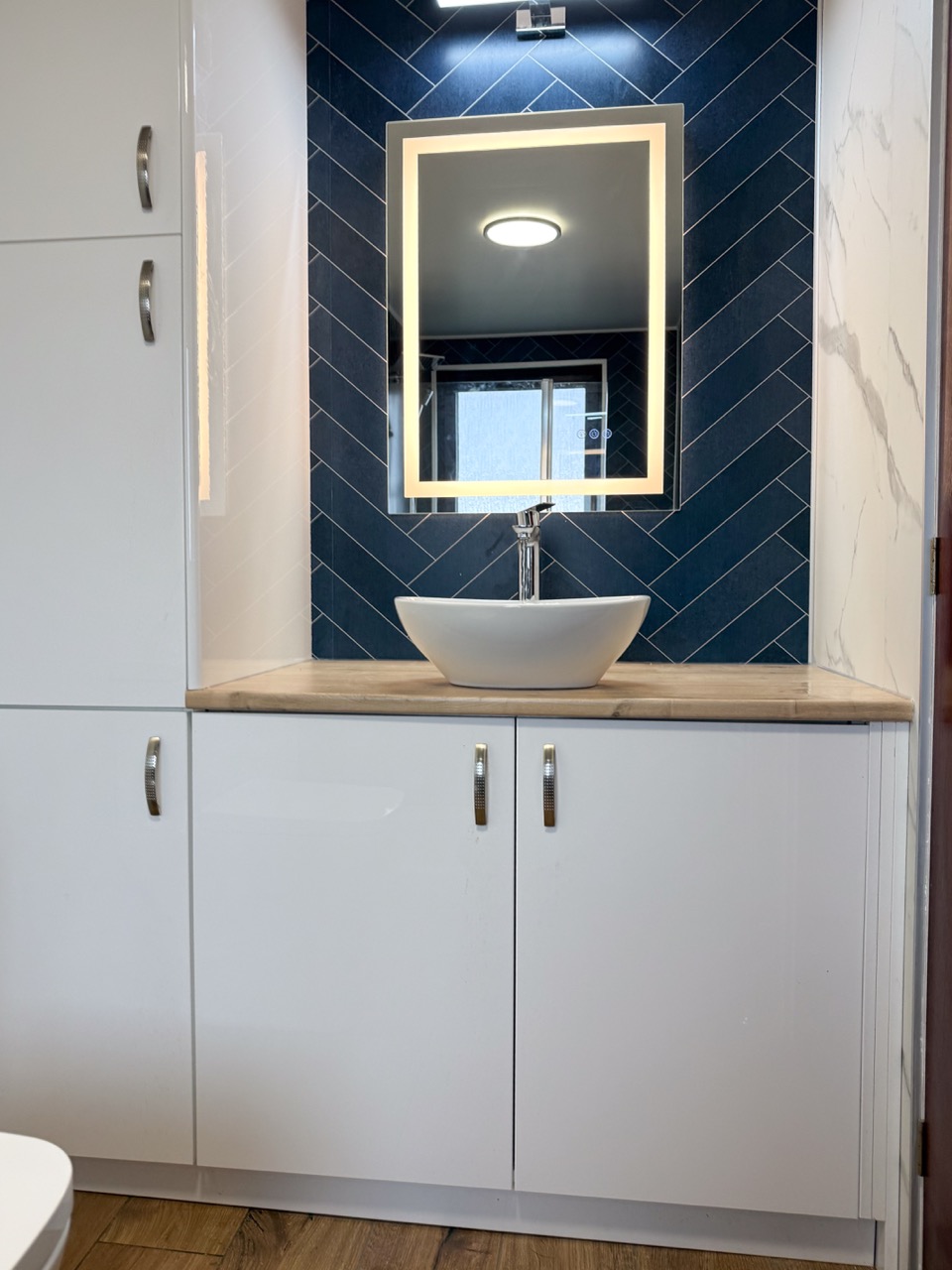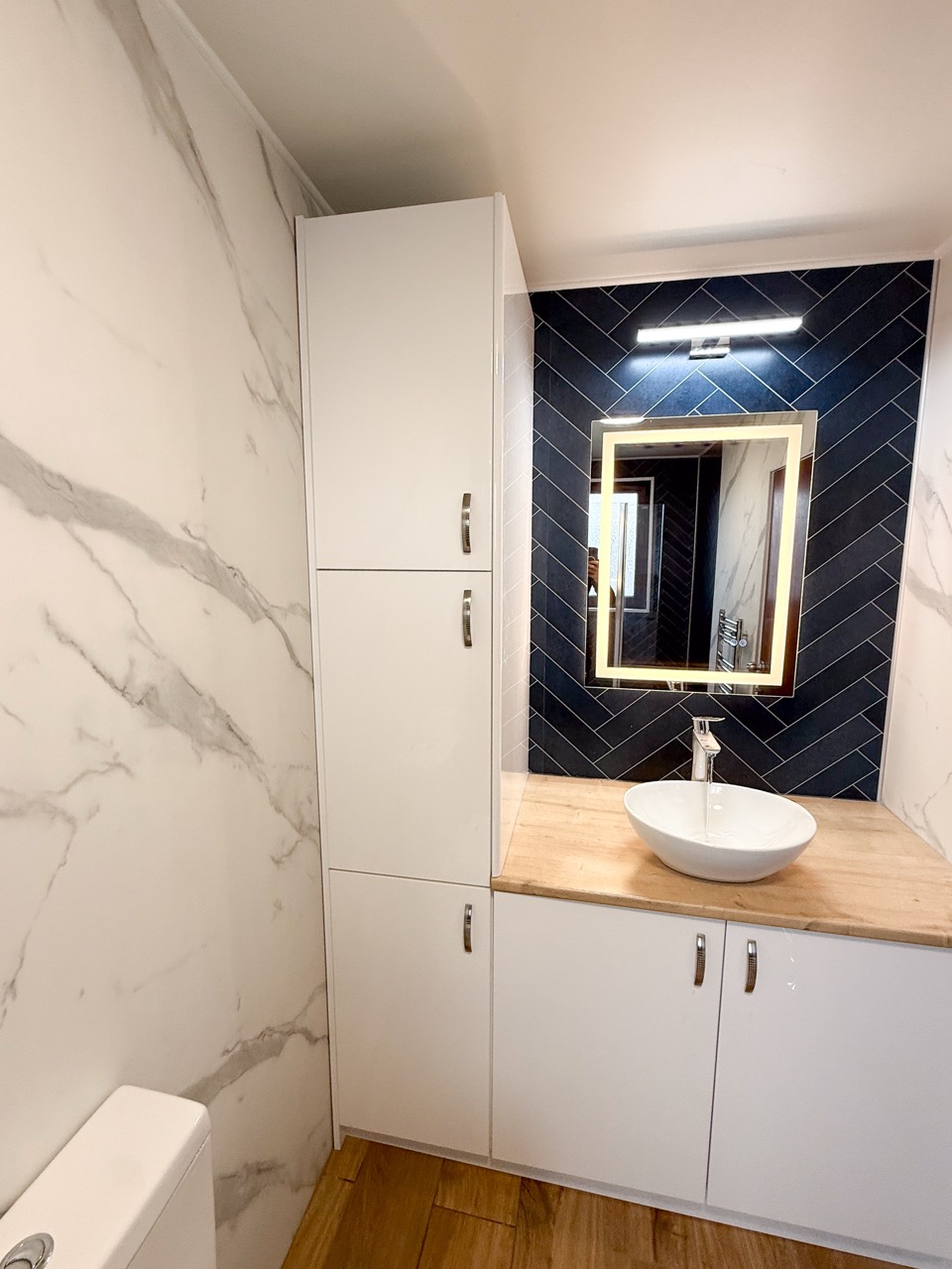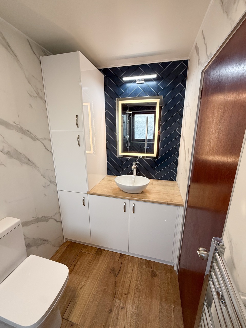For everyday comfort, we fitted a comfort-height toilet, a towel radiator, a UPVC ceiling with a single light, an LED mirror and an additional light above the mirror to improve visibility. Storage was also a big part of this design, with deep 600mm custom-built units, a countertop basin and a tall larder unit at the end, giving the customer plenty of practical space to keep the bathroom tidy and organised.