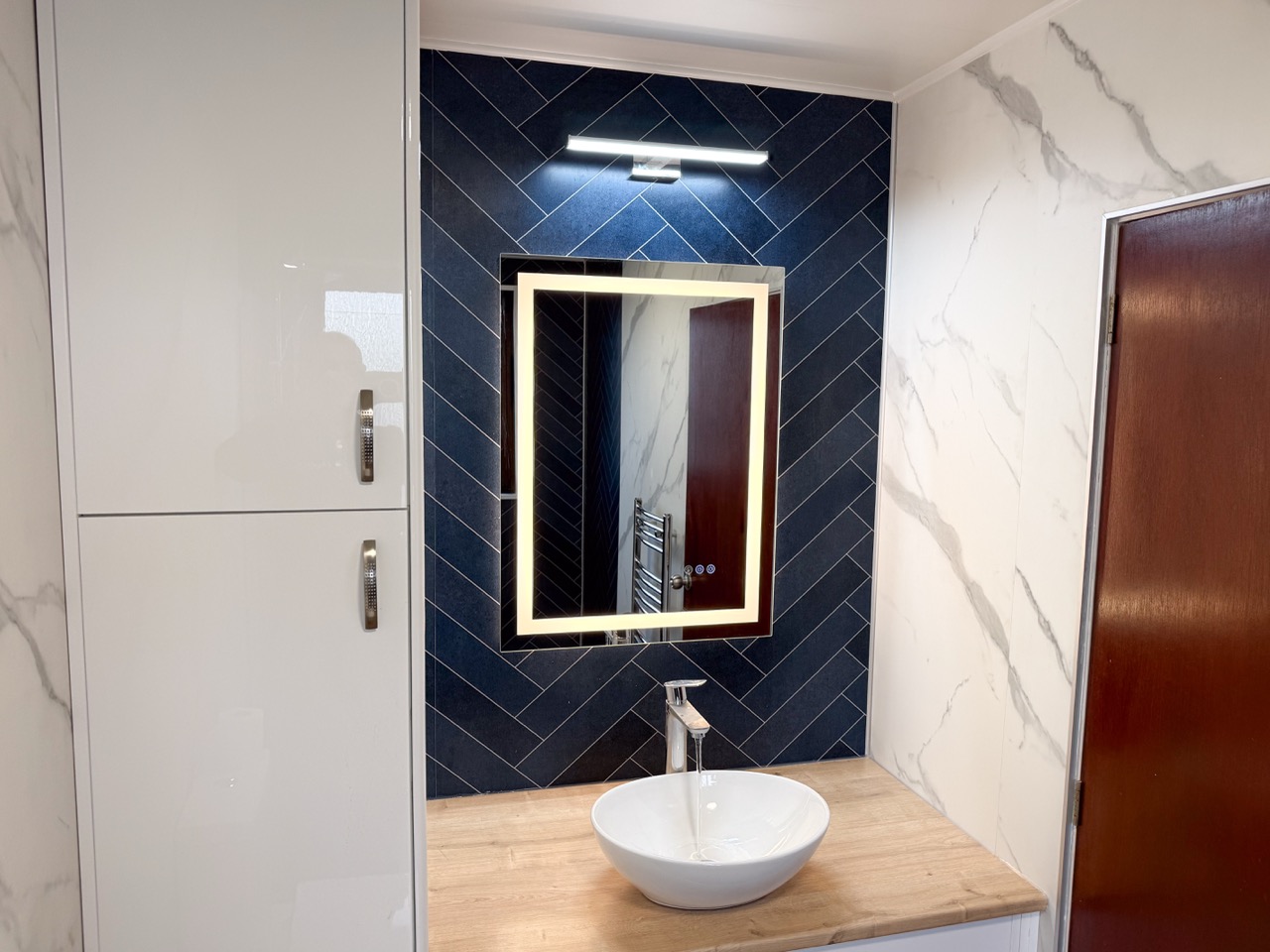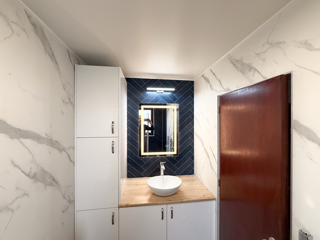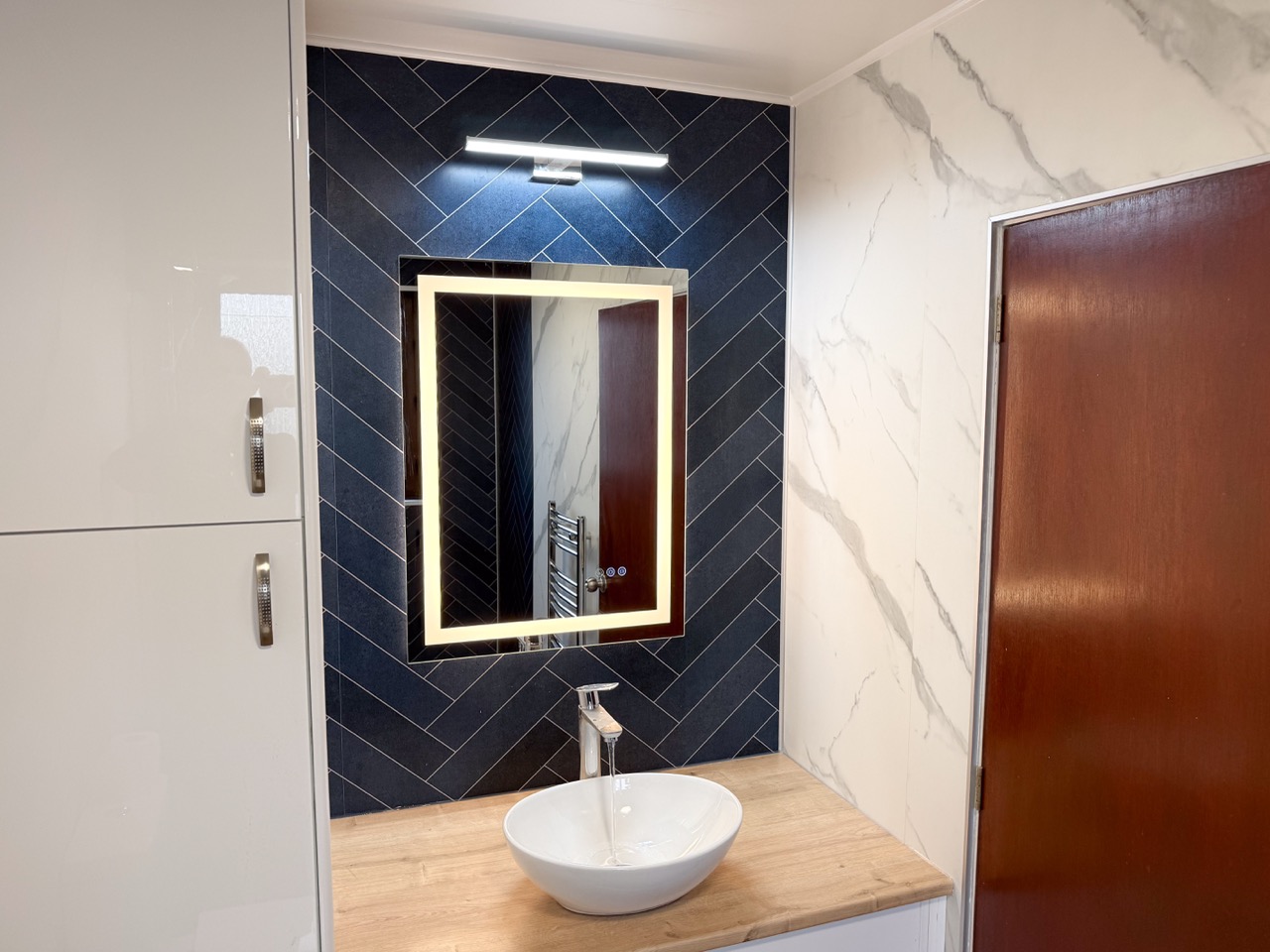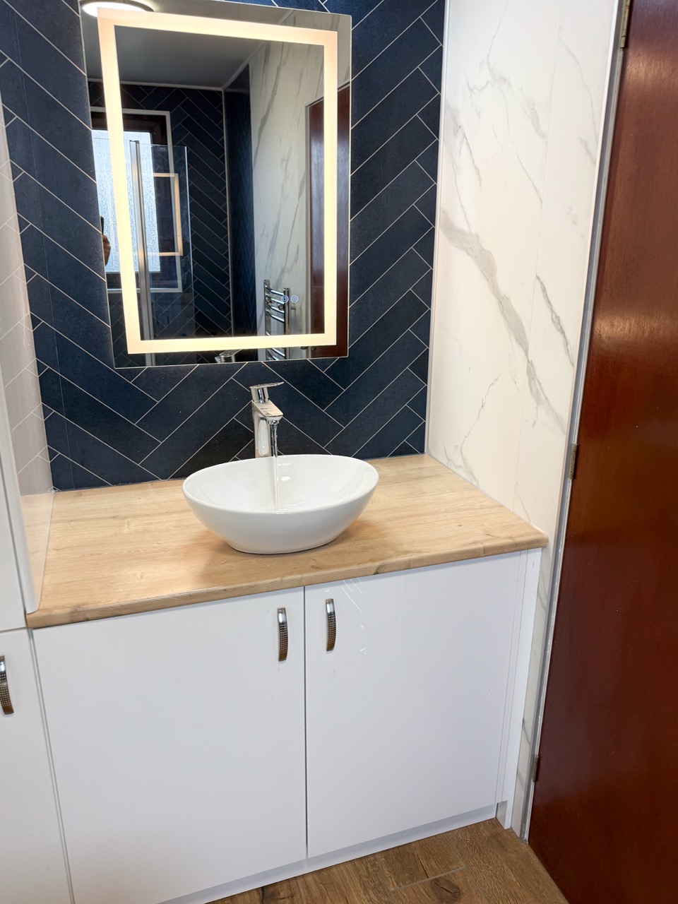 For everyday comfort, we fitted a comfort-height toilet, a towel radiator, a UPVC ceiling with a single light, an LED mirror and an additional light above the mirror to improve visibility. Storage was also a big part of this design, with deep 600mm custom-built units, a countertop basin and a tall larder unit at the end, giving the customer plenty of practical space to keep the bathroom tidy and organised.