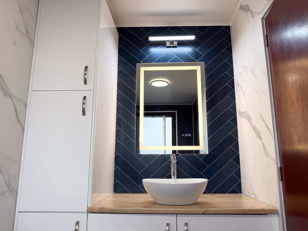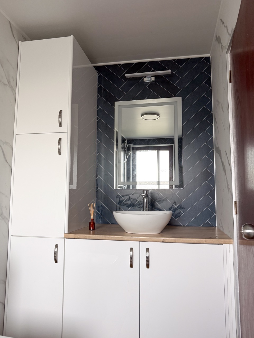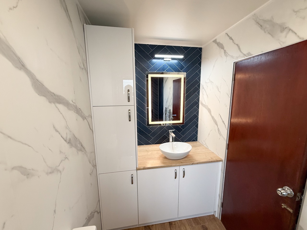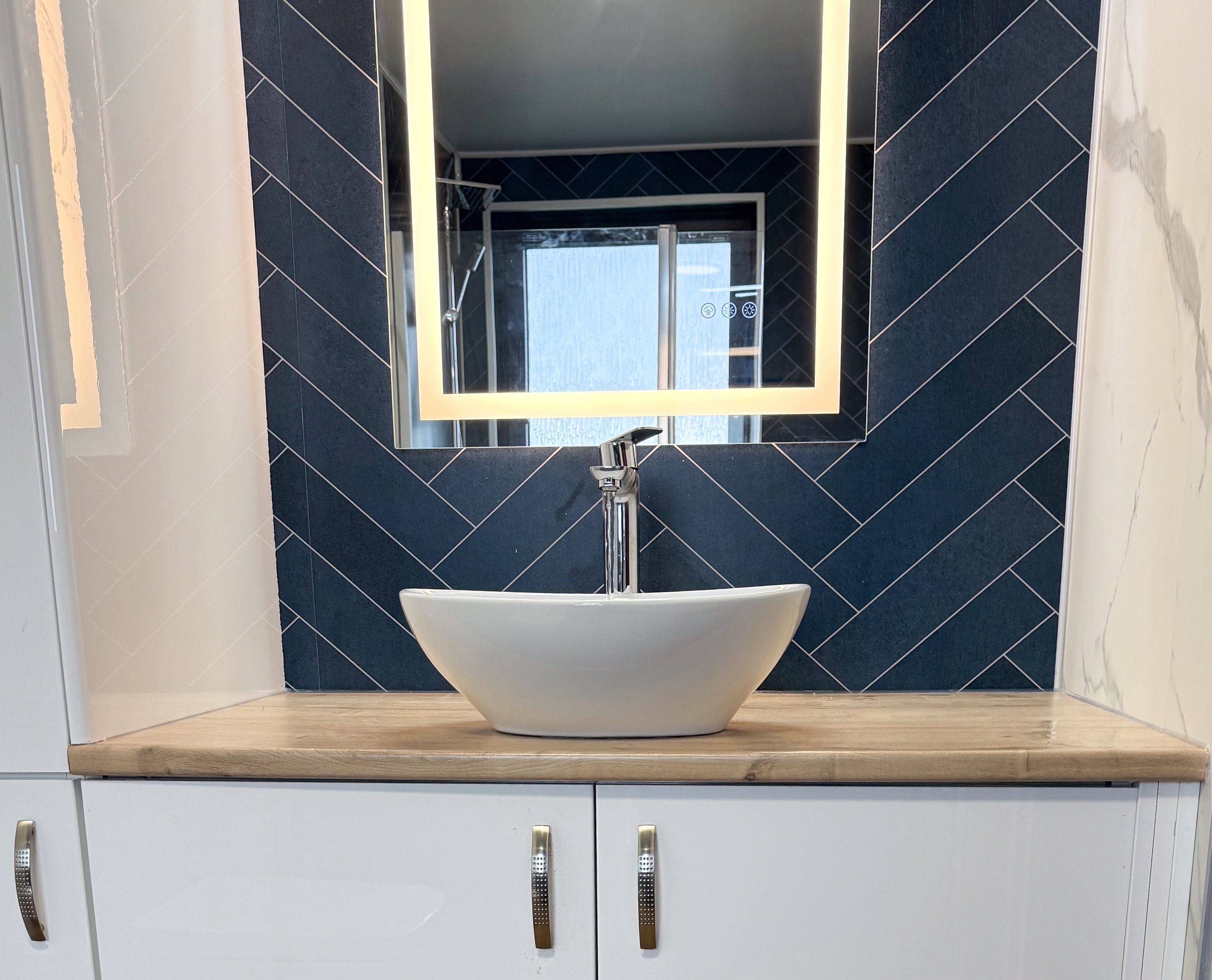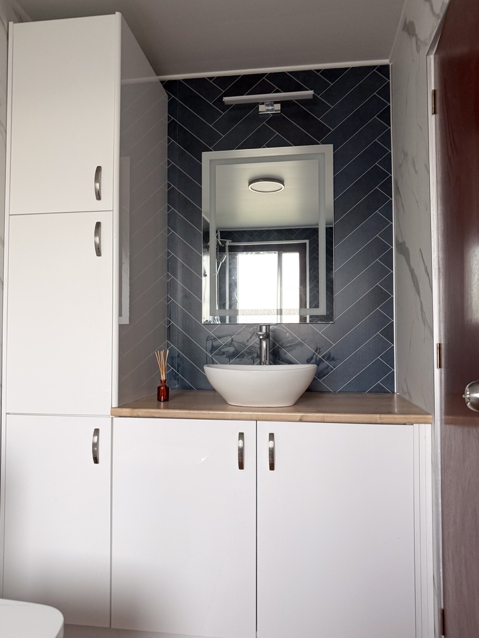For everyday comfort, we fitted a comfort-height toilet, a towel radiator, a UPVC ceiling with a single light, an LED mirror and an additional light above the mirror to improve visibility. Storage was also a big part of this design, with deep 600mm custom-built units, a countertop basin and a tall larder unit at the end, giving the customer plenty of practical space to keep the bathroom tidy and organised.