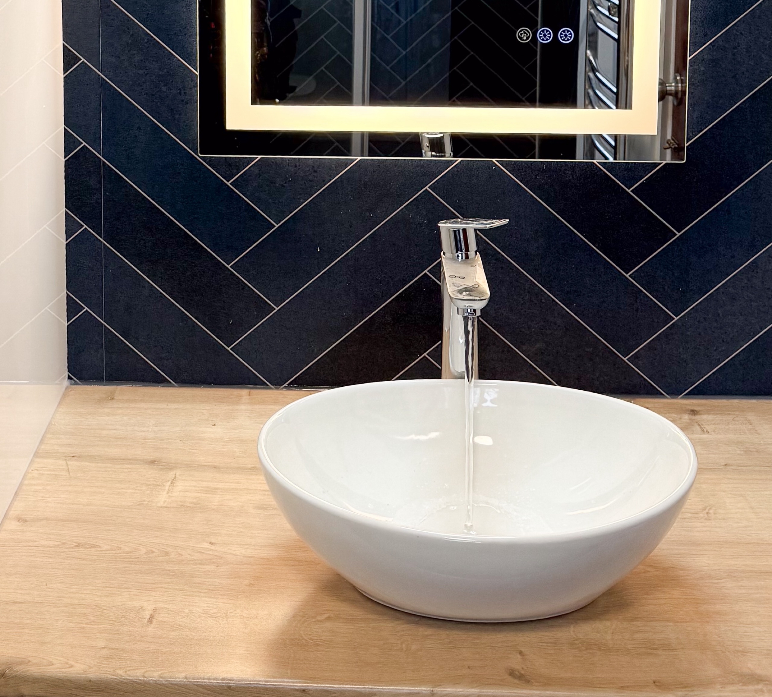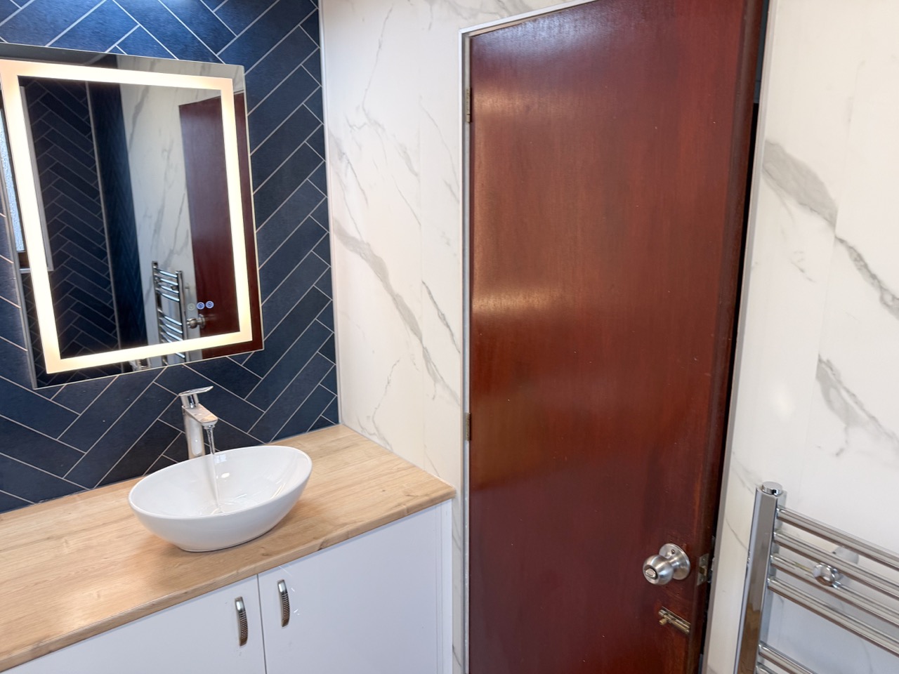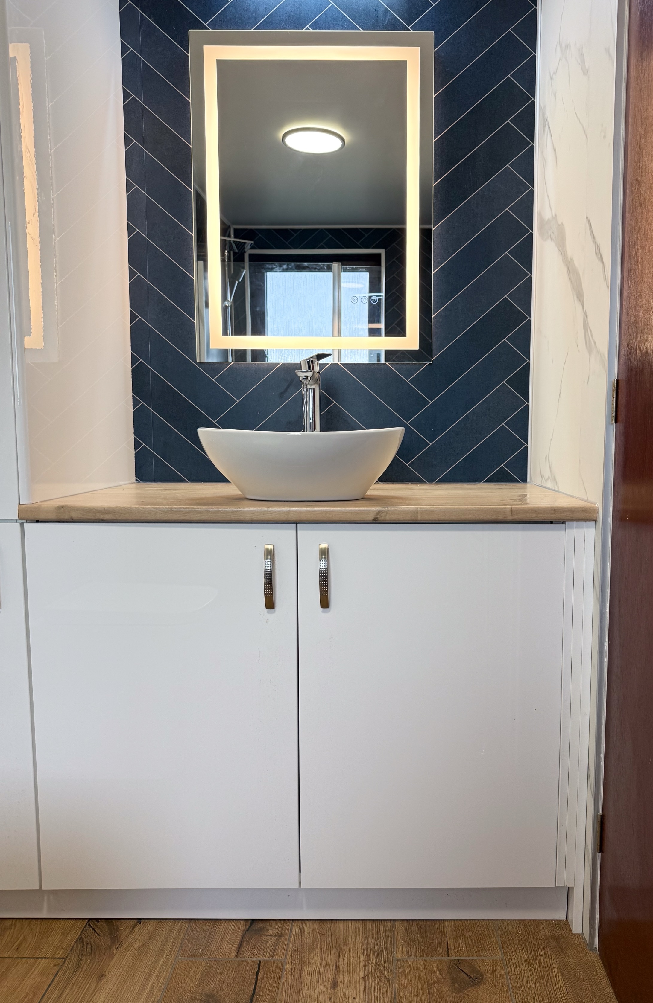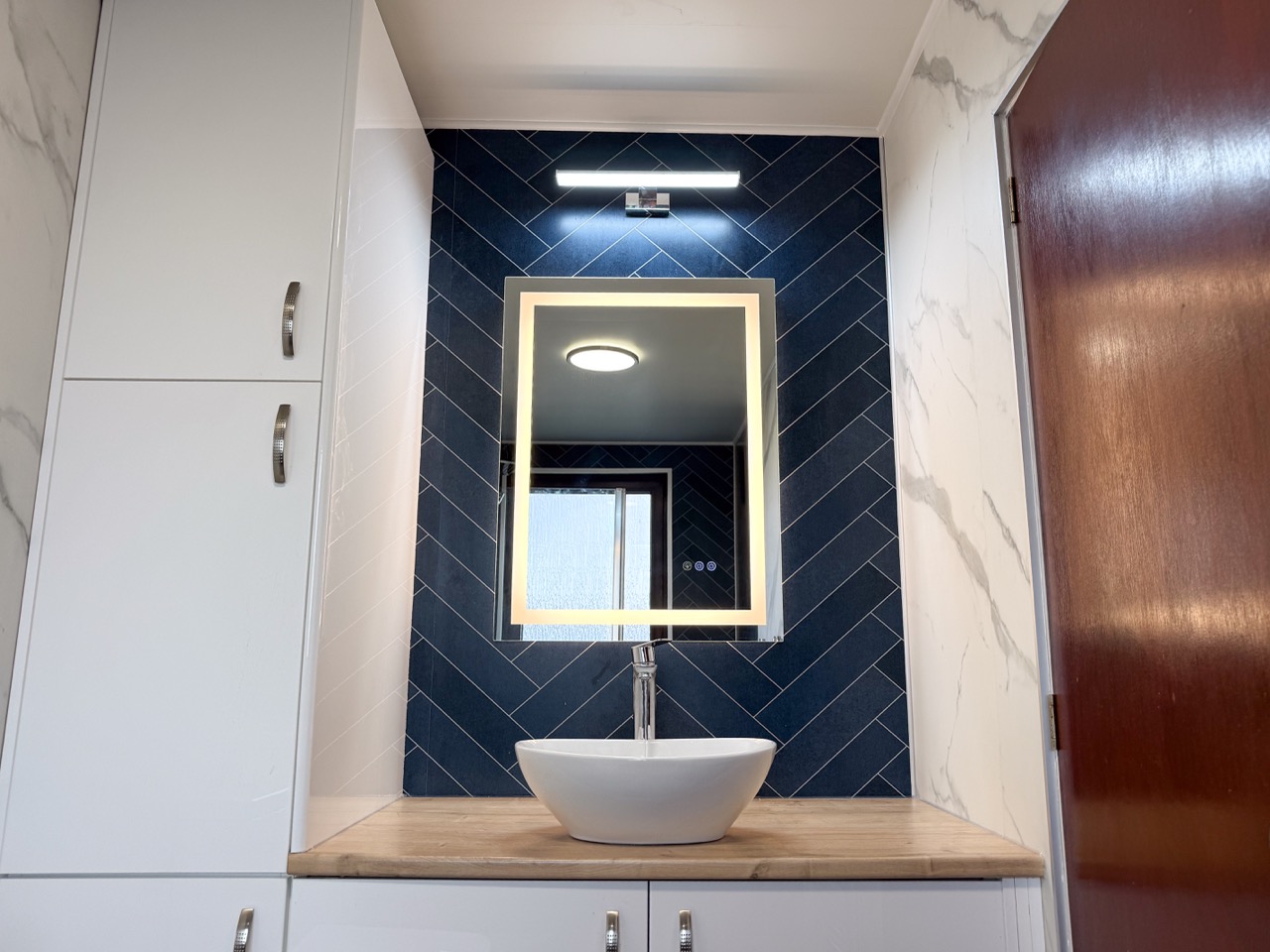 For everyday comfort, we fitted a comfort-height toilet, a towel radiator, a UPVC ceiling with a single light, an LED mirror and an additional light above the mirror to improve visibility. Storage was also a big part of this design, with deep 600mm custom-built units, a countertop basin and a tall larder unit at the end, giving the customer plenty of practical space to keep the bathroom tidy and organised.