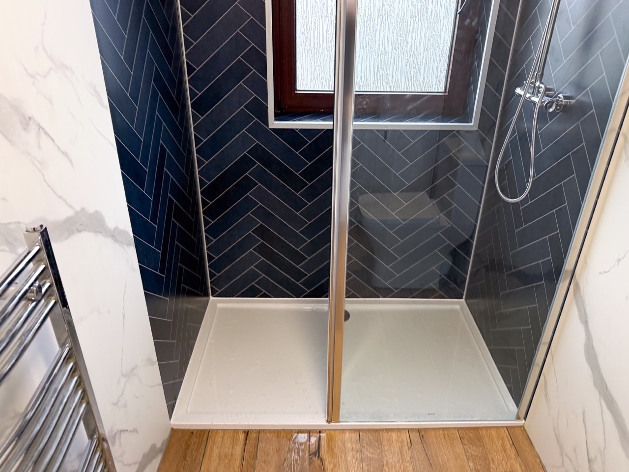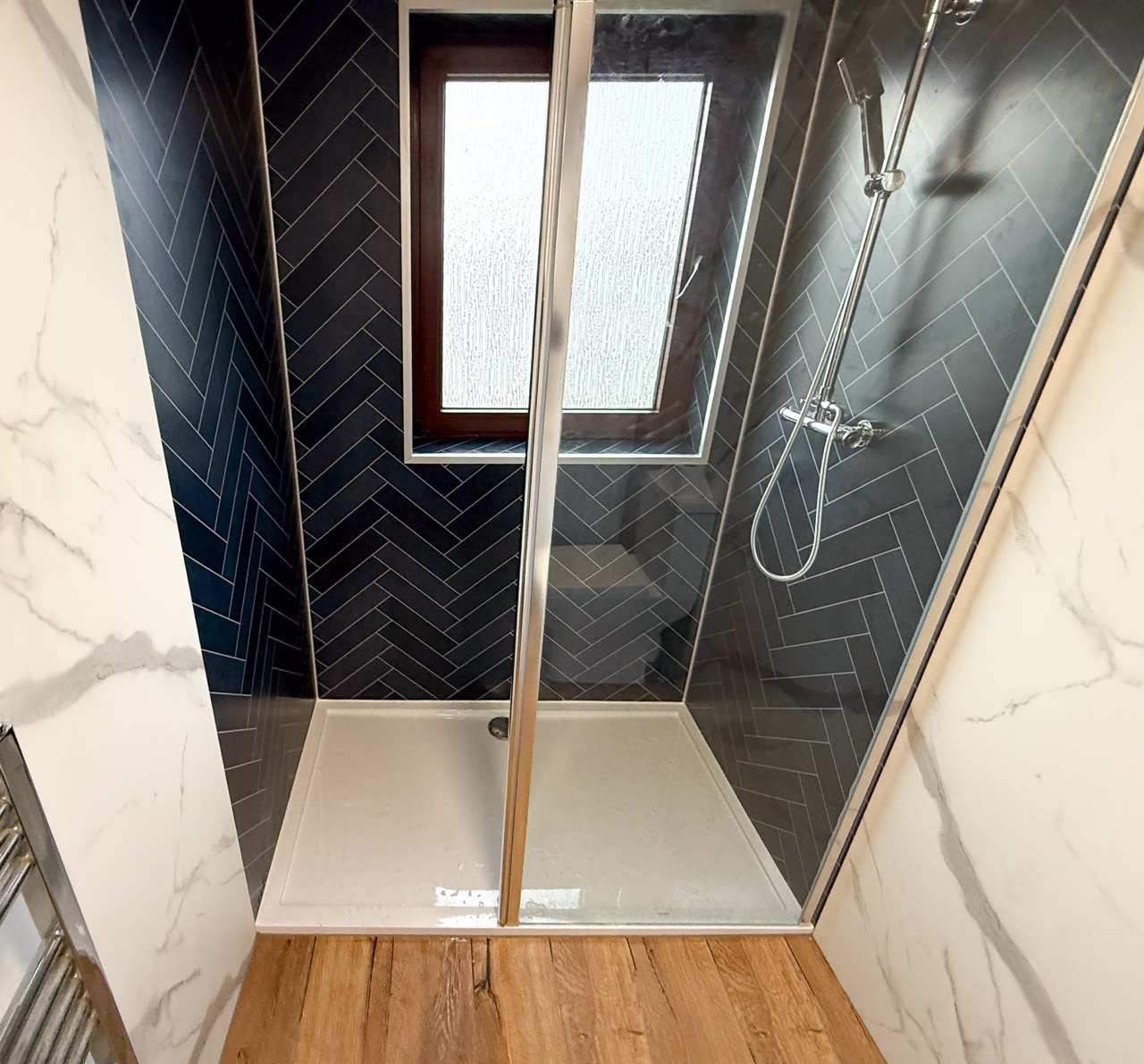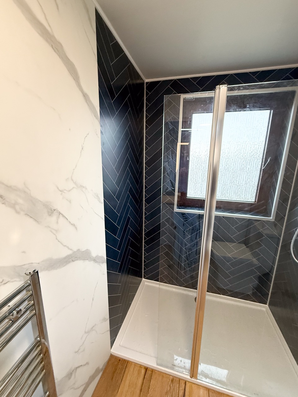 The old bath sat on a raised platform, with tiles throughout the room, which made the space feel dated. We replaced it with a modern walk-in shower in front of the window, fitted with a dual thermostatic shower, a fixed walk-in panel and a flipper panel for better splash protection without closing the space in.