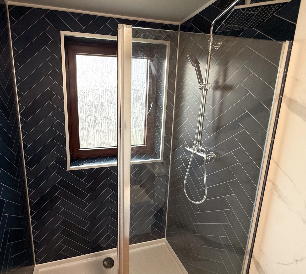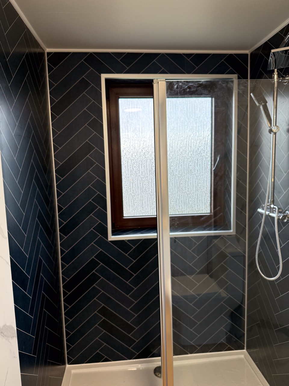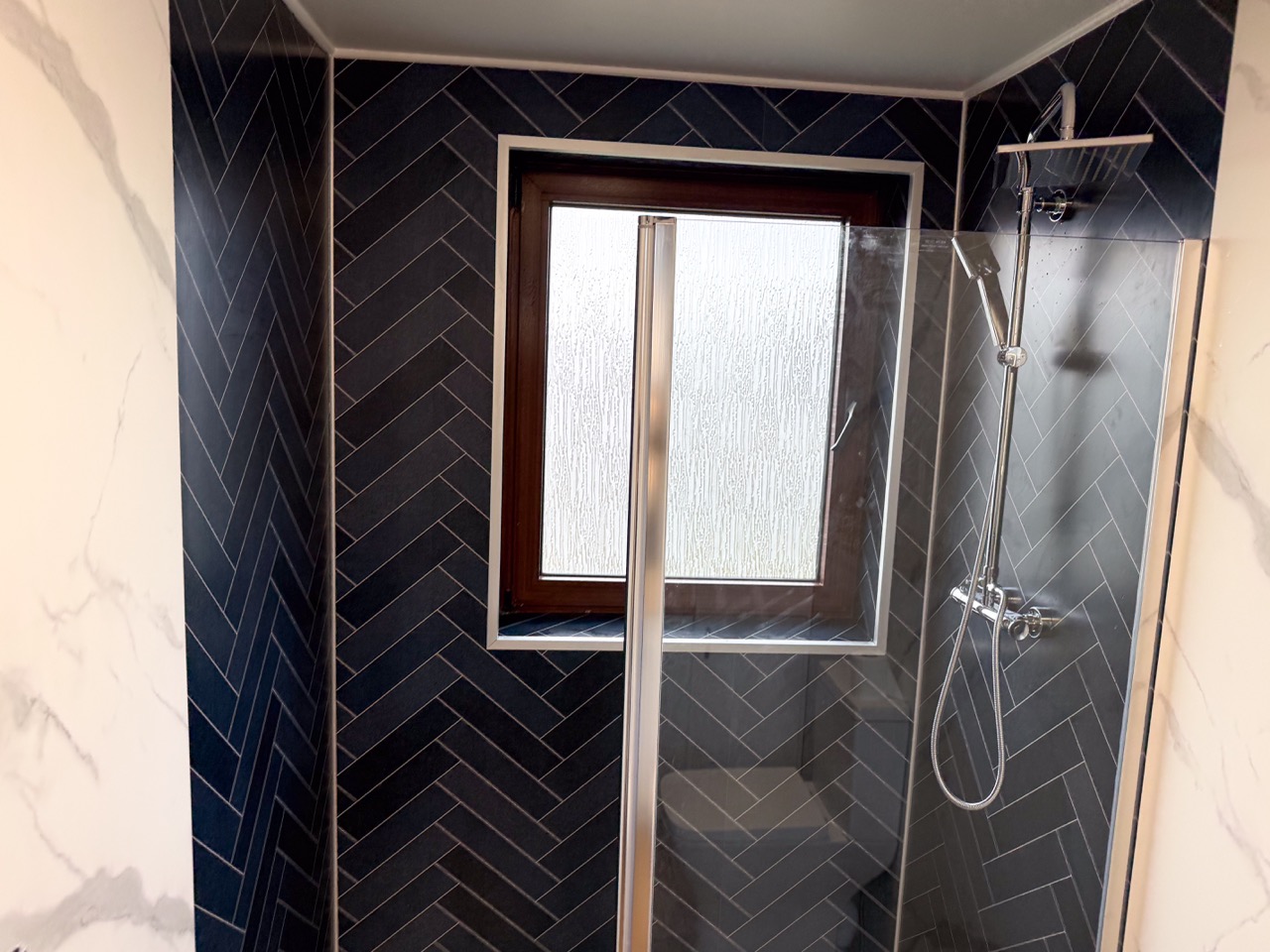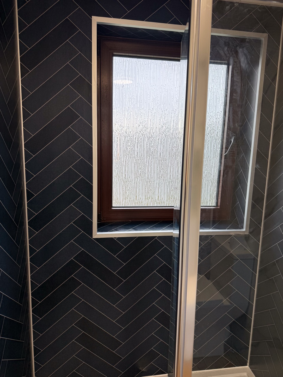 The old bath sat on a raised platform, with tiles throughout the room, which made the space feel dated. We replaced it with a modern walk-in shower in front of the window, fitted with a dual thermostatic shower, a fixed walk-in panel and a flipper panel for better splash protection without closing the space in.