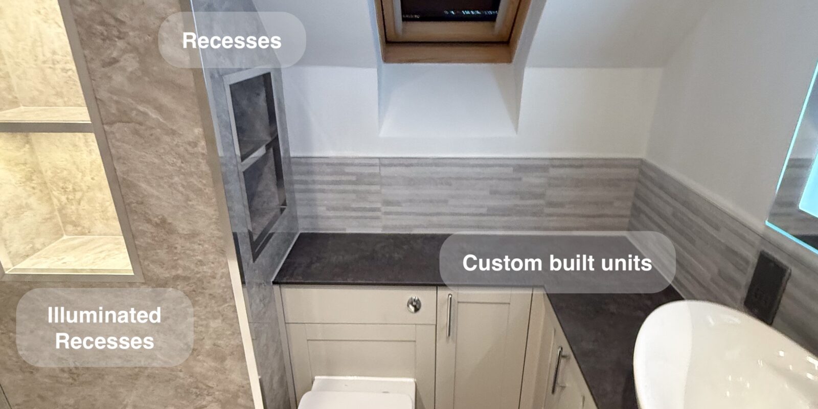 A large walk-in shower became the centrepiece, with softly illuminated recesses at the end and additional niches along the angled wall, so everything you need is always within easy reach. Wall panels in the shower and durable vinyl click flooring keep the room easy to clean, while tiled splashbacks add a refined finish above the units.