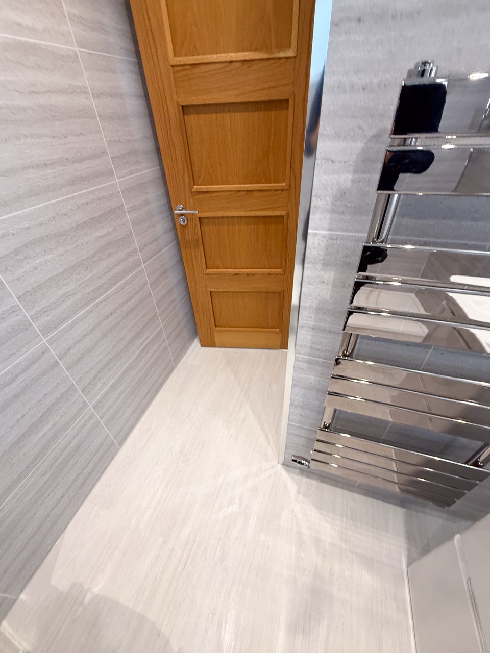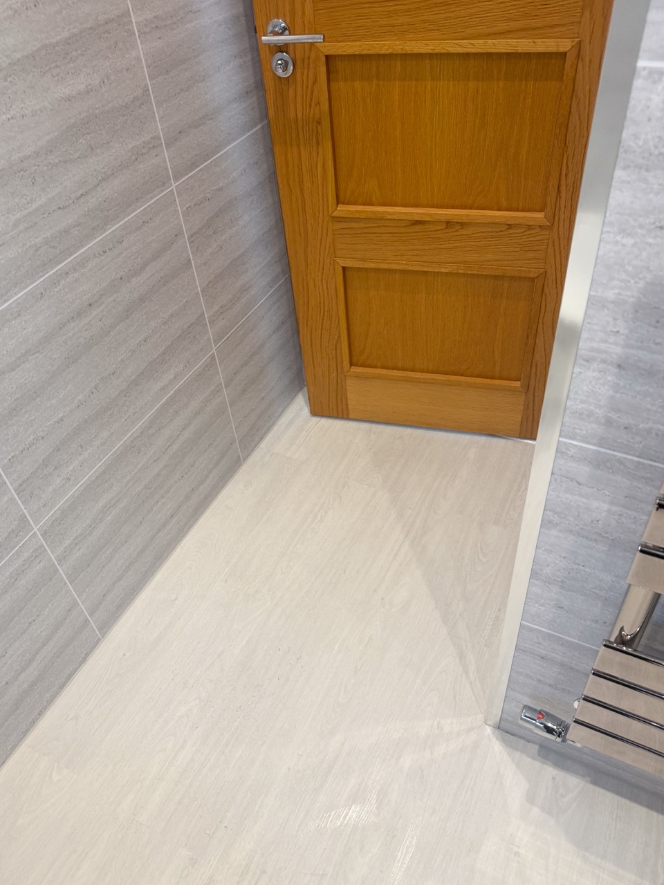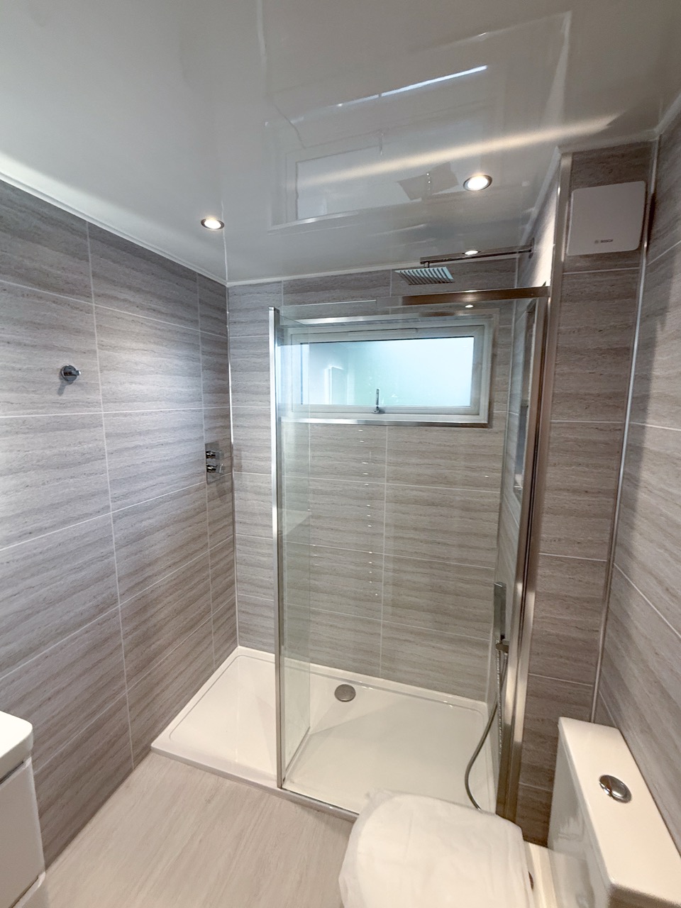 We redesigned the layout to create room for a walk-in shower, giving the customer a much more open and practical daily setup. To keep the room easy to maintain and looking modern, we fitted tile-effect wall panels, paired with vinyl click flooring for a clean finish that’s also durable and water-resistant.