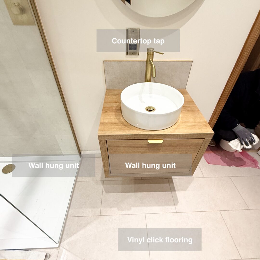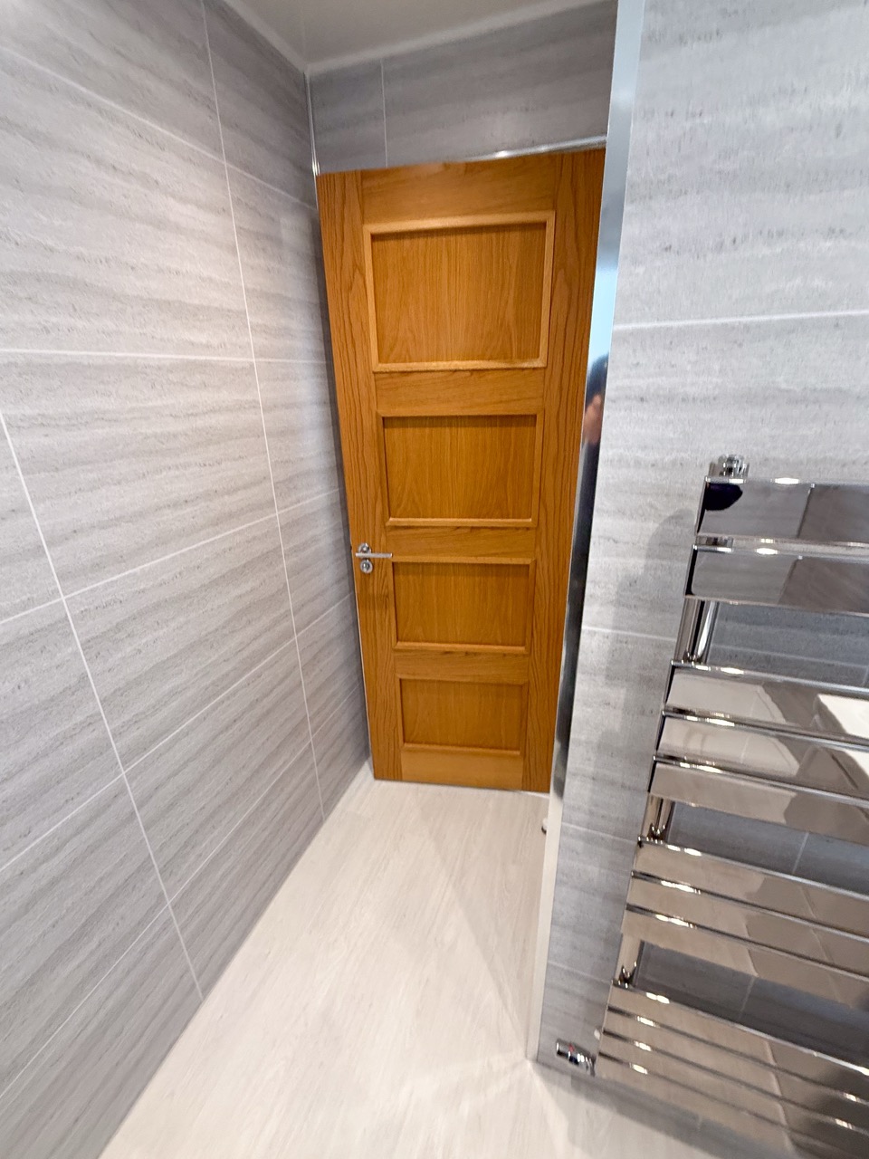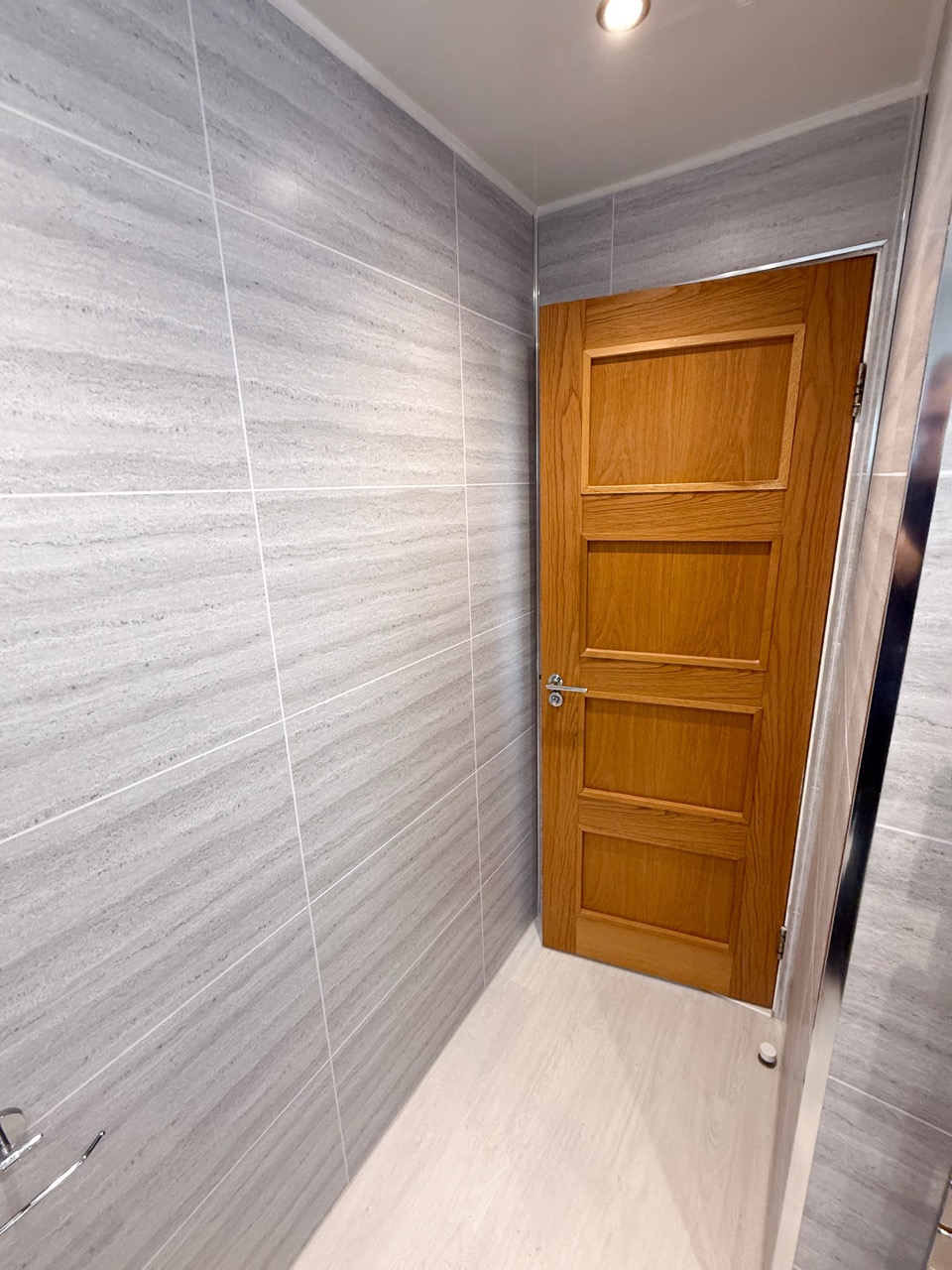 We redesigned the layout to create room for a walk-in shower, giving the customer a much more open and practical daily setup. To keep the room easy to maintain and looking modern, we fitted tile-effect wall panels, paired with vinyl click flooring for a clean finish that’s also durable and water-resistant.