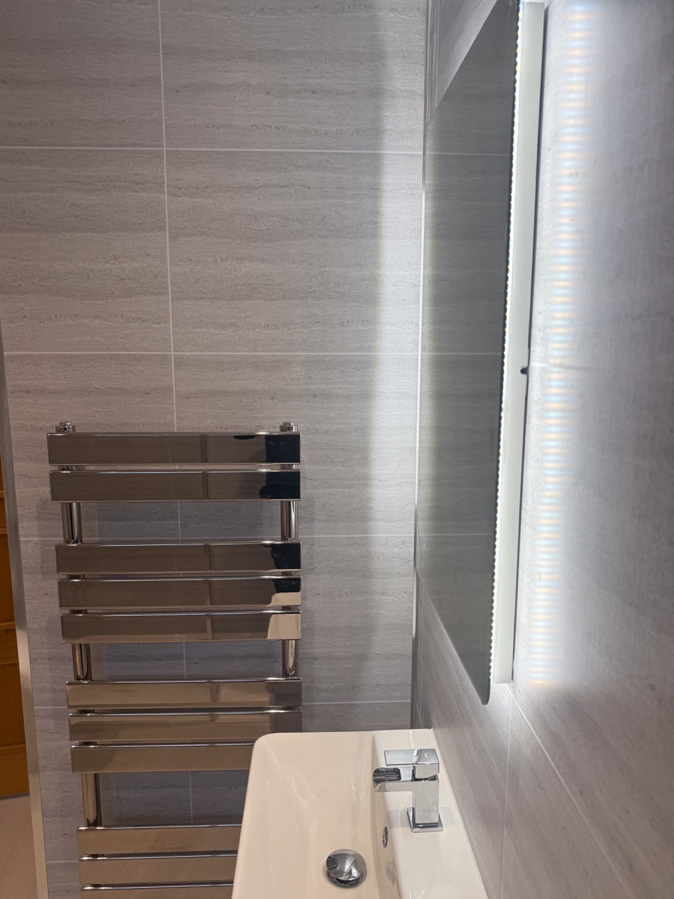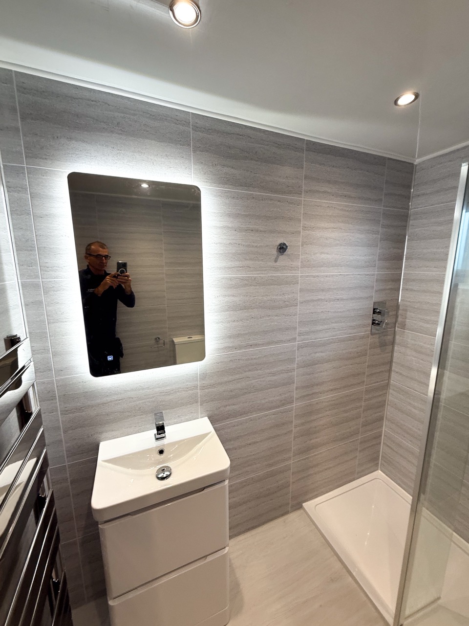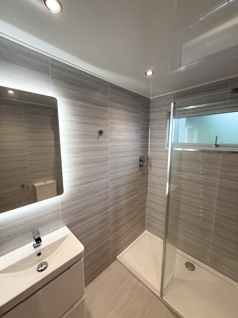 The room was finished with a bright UPVC ceiling and downlights, an LED mirror, and new storage units with drawers to keep everything organised and clutter-free. We also added a towel radiator for everyday comfort, plus a built-in shower recess for toiletries.