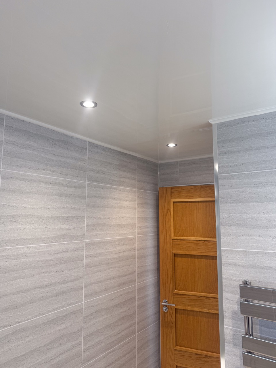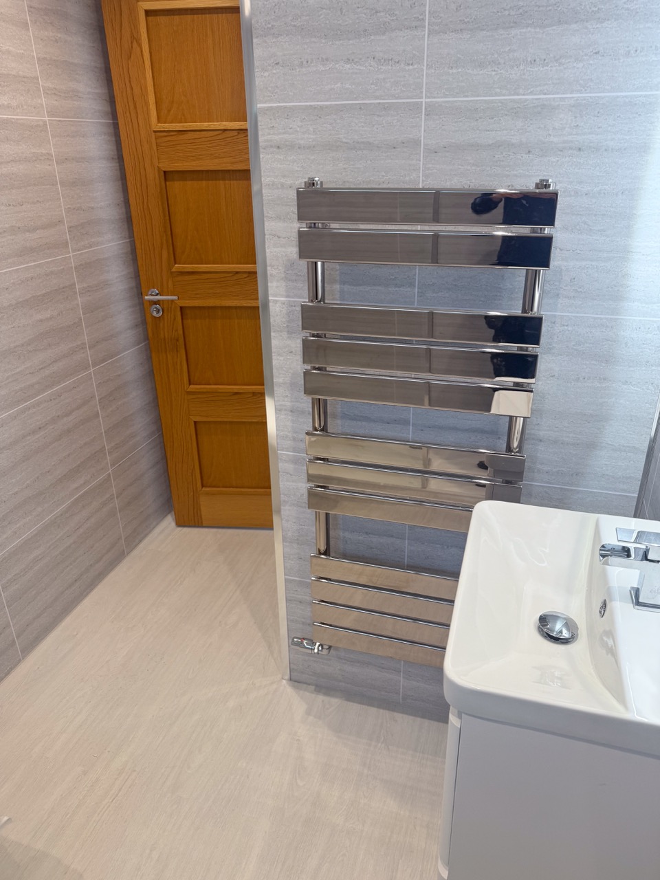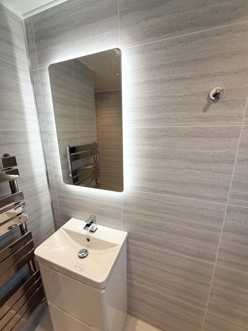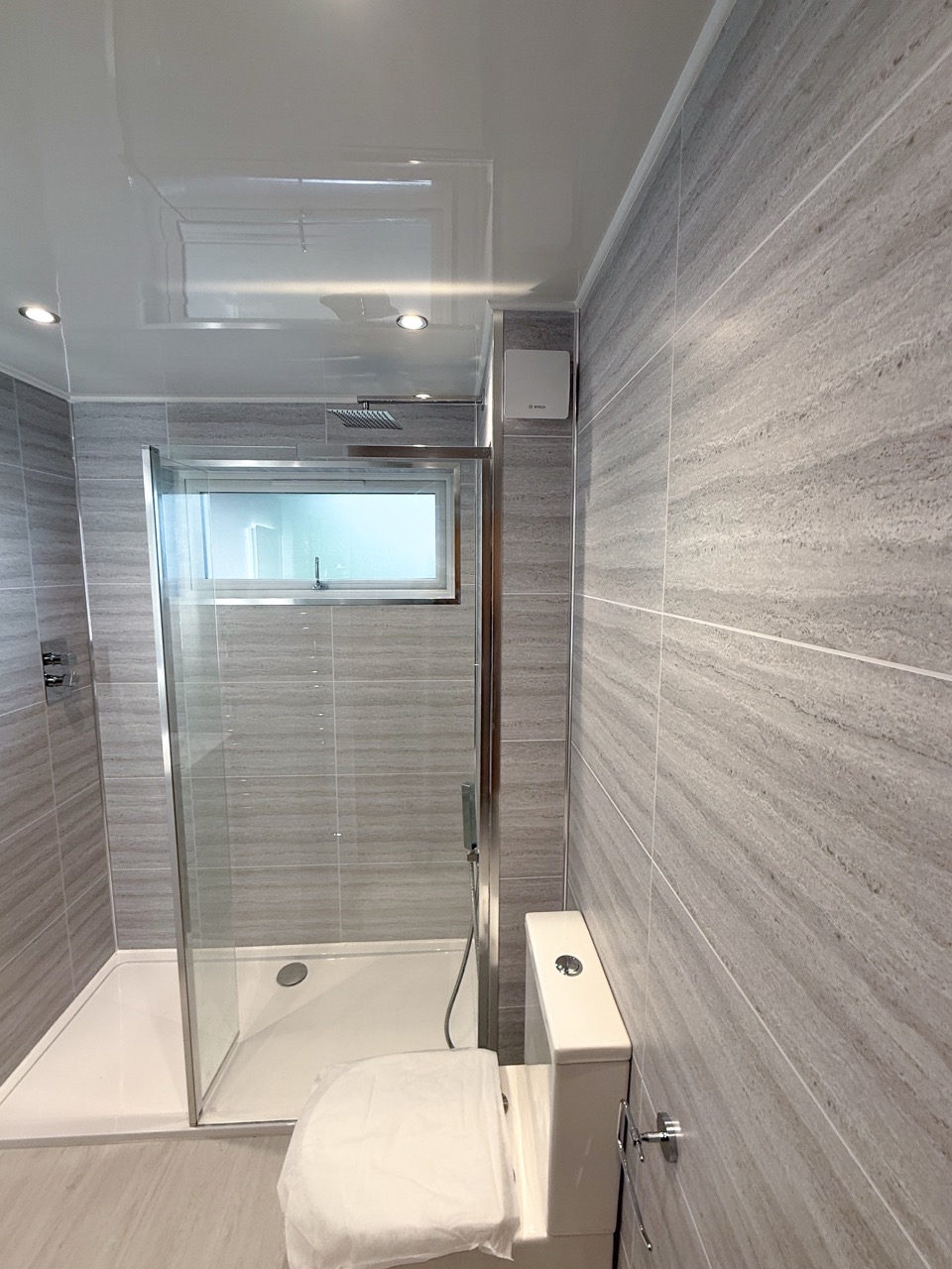 The room was finished with a bright UPVC ceiling and downlights, an LED mirror, and new storage units with drawers to keep everything organised and clutter-free. We also added a towel radiator for everyday comfort, plus a built-in shower recess for toiletries.